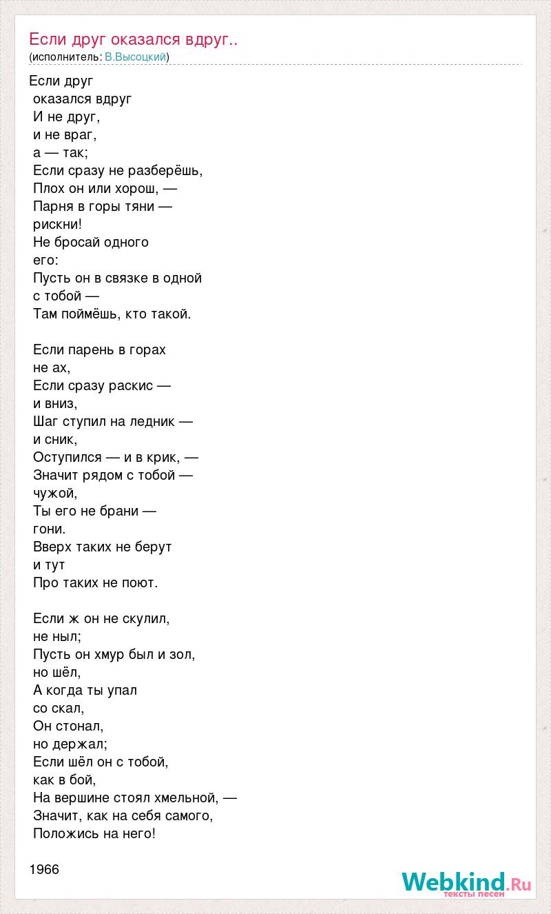 Если друг оказался вдруг И не друг, и не враг, а — так; Если сразу не разберёшь, Плох он или хорош, — Парня в горы тяни — рискни! Не бросай одного его: Пусть он в связке в одной с тобой — Там поймёшь, кто такой. Если парень в горах не ах, Если сразу раскис — и вниз, Шаг ступил на ледник — и сник, Оступился — и в крик, — Значит рядом с тобой — чужой, Ты его не брани — гони. Вверх таких не берут и тут Про таких не поют. Если ж он не скулил, не ныл; Пусть он хмур был и зол, но шёл, А когда ты упал со скал, Он стонал, но держал; Если шёл он с тобой, как в бой, На вершине стоял хмельной, — Значит, как на себя самого, Положись на него! 1966