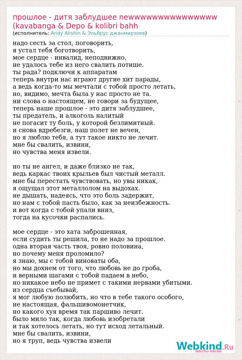 Главная→Исполнители→Andy Alishin & Эльбрус джанмирзоев→Прошлое - дитя заблудшее newwwwwwwwwwwwwww (kavabanga & Depo & kolibri ba
