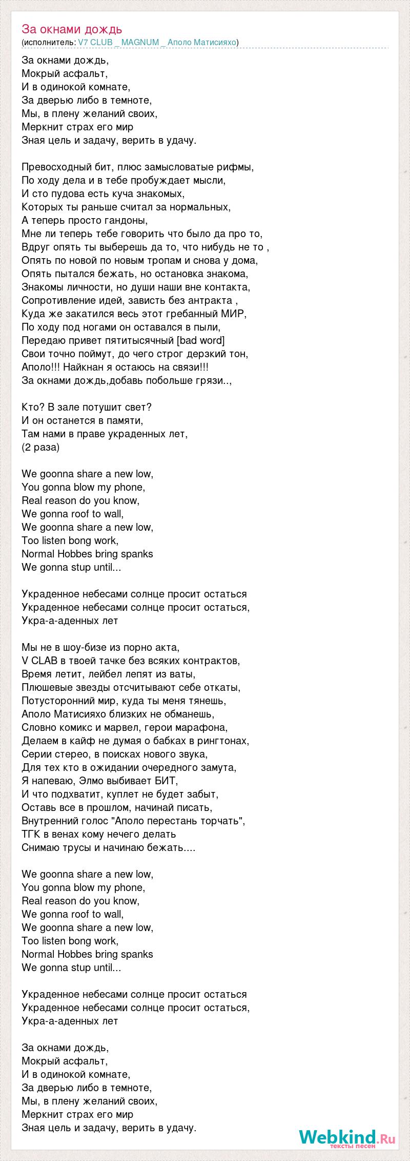 За окнами дождь, Мокрый асфальт, И в одинокой комнате, За дверью либо в темноте, Мы, в плену желаний своих, Меркнит страх его мир Зная цель и задачу, верить в удачу. Превосходный бит, плюс замысловатые рифмы, По ходу дела и в тебе пробуждает мысли, И сто пудова есть куча знакомых, Которых ты раньше считал за нормальных, А теперь просто гандоны, Мне ли теперь тебе говорить что было да про то, Вдруг опять ты выберешь да то, что нибудь не то , Опять по новой по новым тропам и снова у дома, Опять пытался бежать, но остановка знакома, Знакомы личности, но души наши вне контакта, Сопротивление идей, зависть без антракта , Куда же закатился весь этот гребанный МИР, По ходу под ногами он оставался в пыли, Передаю привет пятитысячный [bad word] Свои точно поймут, до чего строг дерзкий тон, Аполо!!! Найкнан я остаюсь на связи!!! За окнами дождь,добавь побольше грязи.., Кто? В зале потушит свет? И он останется в памяти, Там нами в праве украденных лет, (2 раза) We goonna share a new low, You gonna blow my phone, Real reason do you know, We gonna roof to wall, We goonna share a new low, Too listen bong work, Normal Hobbes bring spanks We gonna stup until... Украденное небесами солнце просит остаться Украденное небесами солнце просит остаться, Укра-а-аденных лет Мы не в шоу-бизе из порно акта, V CLAB в твоей тачке без всяких контрактов, Время летит, лейбел лепят из ваты, Плюшевые звезды отсчитывают себе откаты, Потусторонний мир, куда ты меня тянешь, Аполо Матисияхо близких не обманешь, Словно комикс и марвел, герои марафона, Делаем в кайф не думая о бабках в рингтонах, Серии стерео, в поисках нового звука, Для тех кто в ожидании очередного замута, Я напеваю, Элмо выбивает БИТ, И что подхватит, куплет не будет забыт, Оставь все в прошлом, начинай писать, Внутренний голос "Аполо перестань торчать", ТГК в венах кому нечего делать Снимаю трусы и начинаю бежать.... We goonna share a new low, You gonna blow my phone, Real reason do you know, We gonna roof to wall, We goonna share a new low, Too listen bong work, Normal Hobbes bring spanks We gonna stup until... Украденное небесами солнце просит остаться Украденное небесами солнце просит остаться, Укра-а-аденных лет За окнами дождь, Мокрый асфальт, И в одинокой комнате, За дверью либо в темноте, Мы, в плену желаний своих, Меркнит страх его мир Зная цель и задачу, верить в удачу.