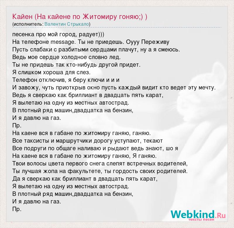 песенка про мой город, радует))) На телефоне message. Ты не приедешь. Оууу Переживу Пусть слабаки с разбитыми сердцами плачут, ну а я смеюсь. Ведь мое сердце холодное словно лед. Ты не придешь так кто-нибудь другой придет. Я слишком хороша для слез. Телефон отключив, я беру ключи и и и И завожу, чуть приоткрыв окно пусть каждый видит кто ведет эту мечту. Ведь я сверкаю как бриллиант в двадцать пять карат, Я вылетаю на одну из местных автострад. В плотный ряд машин,двадцатка на бензин, И я давлю на газ. Пр. На каене вся в габане по житомиру ганяю, ганяю. Все таксисты и маршрутчики дорогу уступают, текают Все подруги по общаге наливаю и рыдают ведь знают, шо я На каене вся в габане по житомиру ганяю, Я ганяю. Твои волосы цвета первого снега слепят встречных водителей, Ты лучшая жопа на факультете, ты гордость своих родителей. Да я сверкаю как бриллиант в двадцать пять карат, Я вылетаю на одну из местных автострад. В плотный ряд машин,двадцатка на бензин, И я давлю на газ. Пр.