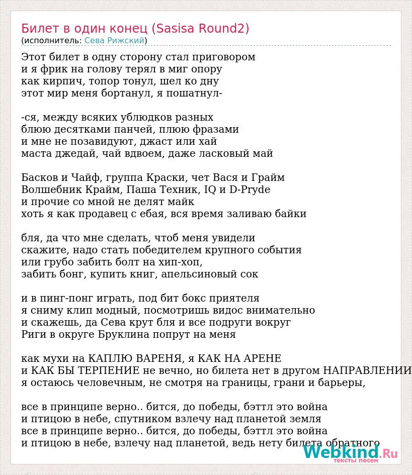 Этот билет в одну сторону стал приговором и я фрик на голову терял в миг опору как кирпич, топор тонул, шел ко дну этот мир меня бортанул, я пошатнул- -ся, между всяких ублюдков разных блюю десятками панчей, плюю фразами и мне не позавидуют, джаст или хай маста джедай, чай вдвоем, даже ласковый май Басков и Чайф, группа Краски, чет Вася и Грайм Волшебник Крайм, Паша Техник, IQ и D-Pryde и прочие со мной не делят майк хоть я как продавец с ебая, вся время заливаю байки бля, да что мне сделать, чтоб меня увидели скажите, надо стать победителем крупного события или грубо забить болт на хип-хоп, забить бонг, купить книг, апельсиновый сок и в пинг-понг играть, под бит бокс приятеля я сниму клип модный, посмотришь видос внимательно и скажешь, да Сева крут бля и все подруги вокруг Риги в округе Бруклина попрут на меня как мухи на КАПЛЮ ВАРЕНЯ, я КАК НА АРЕНЕ и КАК БЫ ТЕРПЕНИЕ не вечно, но билета нет в другом НАПРАВЛЕНИИ я остаюсь человечным, не смотря на границы, грани и барьеры, все в принципе верно.. бится, до победы, бэттл это война и птицою в небе, спутником взлечу над планетой земля все в принципе верно.. бится, до победы, бэттл это война и птицою в небе, взлечу над планетой, ведь нету билета обратного