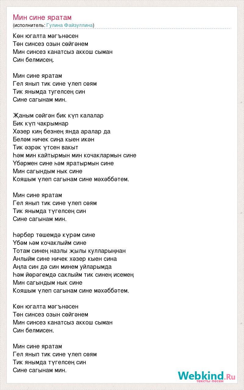 Көн югалта мәгънәсен Төн синсез озын сөйгәнем Мин синсез канатсыз аккош сыман Син белмисең. Мин сине яратам Гел янып тик сине үлеп сөям Тик янымда тугелсең син Сине сагынам мин. Җаным сөйгән бик күп калалар Бик күп чакрымнар Хәзер киң безнең янда аралар да Беләм ничек сиңа кыен икән Тик әзрәк үтсен вакыт Һәм мин кайтырмын мин кочаклармын сине Үбәрмен сине һәм яратырмын сине Мин сагындым нык сине Кояшым үлеп сагынам сине мәхәббәтем. Мин сине яратам Гел янып тик сине үлеп сөям Тик янымда түгелсең син Сине сагынам мин. Һәрбер төшемдә күрәм сине Үбәм һәм кочаклыйм сине Тотам синең назлы җылы кулларыңнан Анлыйм сине ничек хәзер кыен сина Аңла син дә син минем уйларымда Һәм йөрәгемдә саклыйм тик синең исемең Мин сагындым нык сине Кояшым үлеп сагынам сине мәхәббәтем. Көн югалта мәгънәсен Төн синсез озын сөйгәнем Мин синсез канатсыз аккош сыман Син белмисен. Мин сине яратам Гел янып тик сине үлеп сөям Тик янымда түгелсең син Сине сагынам мин.