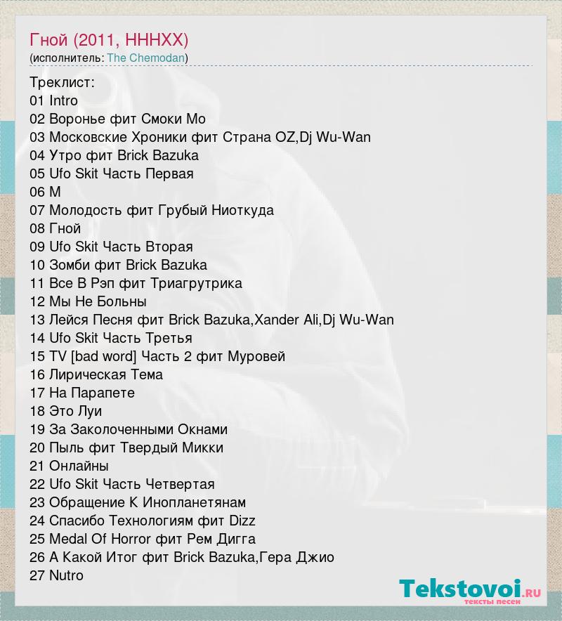 Треклист: 01 Intro 02 Воронье фит Смоки Мо 03 Московские Хроники фит Страна OZ,Dj Wu-Wan 04 Утро фит Brick Bazuka 05 Ufo Skit Часть Первая 06 М 07 Молодость фит Грубый Ниоткуда 08 Гной 09 Ufo Skit Часть Вторая 10 Зомби фит Brick Bazuka 11 Все В Рэп фит Триагрутрика 12 Мы Не Больны 13 Лейся Песня фит Brick Bazuka,Xander Ali,Dj Wu-Wan 14 Ufo Skit Часть Третья 15 TV [bad word] Часть 2 фит Муровей 16 Лирическая Тема 17 На Парапете 18 Это Луи 19 За Заколоченными Окнами 20 Пыль фит Твердый Микки 21 Онлайны 22 Ufo Skit Часть Четвертая 23 Обращение К Инопланетянам 24 Спасибо Технологиям фит Dizz 25 Medal Of Horror фит Рем Дигга 26 А Какой Итог фит Brick Bazuka,Гера Джио 27 Nutro