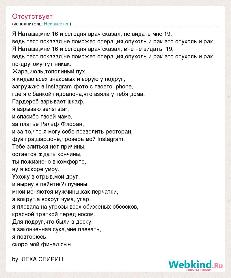 Я Наташа,мне 16 и сегодня врач сказал, не видать мне 19, ведь тест показал,не поможет операция,опухоль и рак,это опухоль и рак Я Наташа,мне 16 и сегодня врач сказал, мне не видать 19, ведь тест показал,не поможет операция,опухоль и рак,это опухоль и рак, по-другому тут никак. Жара,июль,тополиный пух, я кидаю всех знакомых и ворую у подруг, загружаю в Instagram фото с твоего Iphone, где я с банкой гидрапона,что взяла у тебя дома. Гардероб взрывает шкаф, я взрываю sensi star, и спасибо твоей маме, за платье Ральф Флоран, и за то,что я могу себе позволить ресторан, фуа гра,шардоне,проверь мой Instagram. Тебе злиться нет причины, остается ждать кончины, ты пожизнено в комфорте, ну я вскоре умру. Ухожу в отрыв,мой друг, и нырну в пейнти(?) пучины, мной меняются мужчины,как перчатки, а вокруг,а вокруг чума, угар, я плевала на угрозы всех обиженых обсосков, красной тряпкой перед носом. Для подруг,что были в доску, я законченная сука,мне плевать, я повторюсь, скоро мой финал,сын. by ЛЁХА СПИРИН