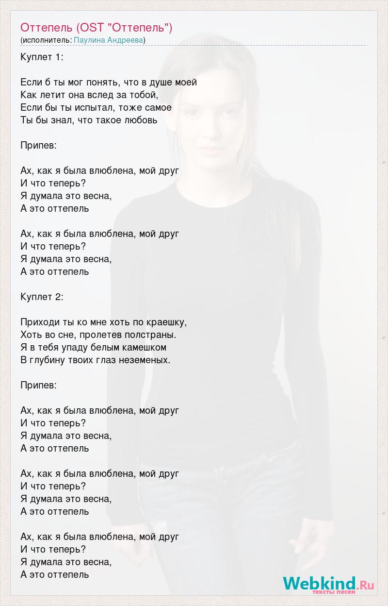 Куплет 1: Если б ты мог понять, что в душе моей Как летит она вслед за тобой, Если бы ты испытал, тоже самое Ты бы знал, что такое любовь Припев: Ах, как я была влюблена, мой друг И что теперь? Я думала это весна, А это оттепель Ах, как я была влюблена, мой друг И что теперь? Я думала это весна, А это оттепель Куплет 2: Приходи ты ко мне хоть по краешку, Хоть во сне, пролетев полстраны. Я в тебя упаду белым камешком В глубину твоих глаз неземеных. Припев: Ах, как я была влюблена, мой друг И что теперь? Я думала это весна, А это оттепель Ах, как я была влюблена, мой друг И что теперь? Я думала это весна, А это оттепель Ах, как я была влюблена, мой друг И что теперь? Я думала это весна, А это оттепель