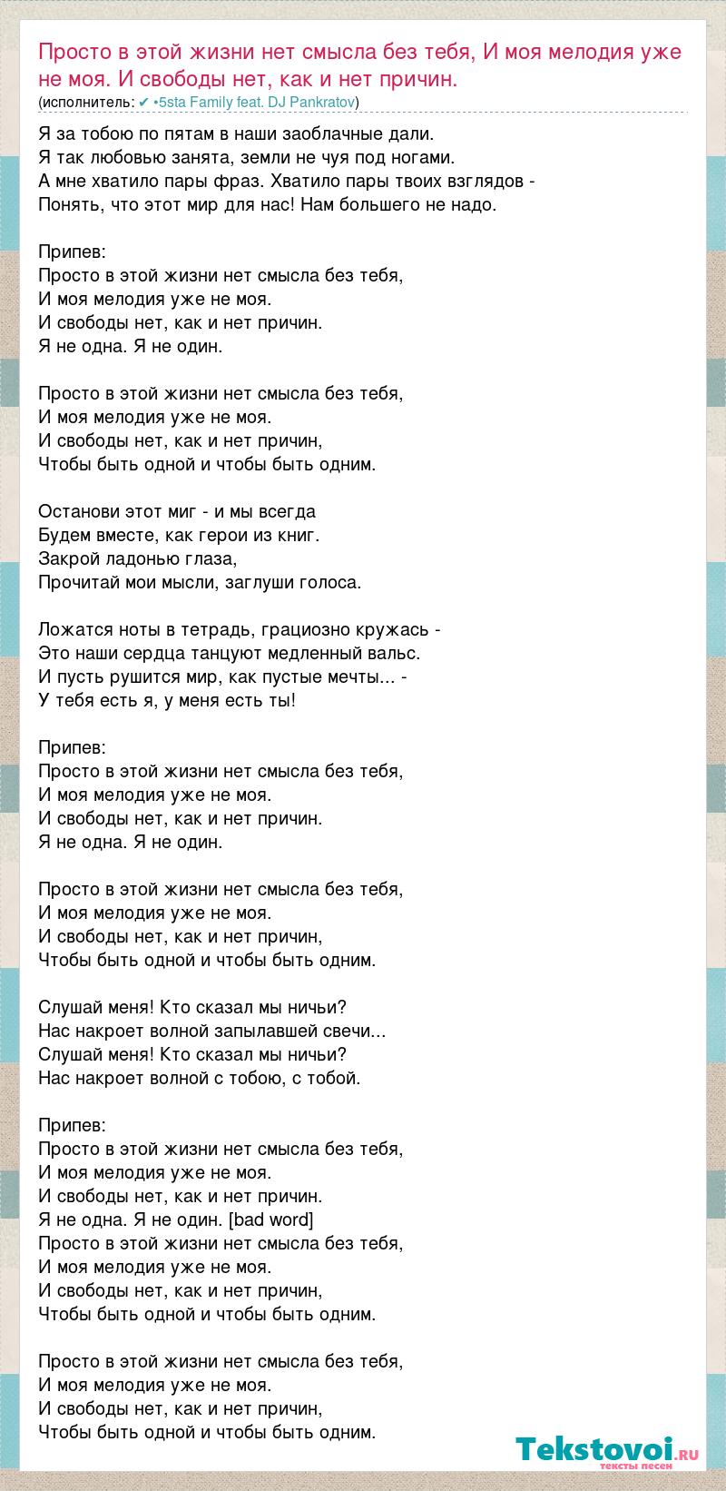 Главная→Исполнители→✔️•5sta Family feat. DJ Pankratov→Просто в этой жизни нет смысла без тебя, И моя мелодия уже не моя. И