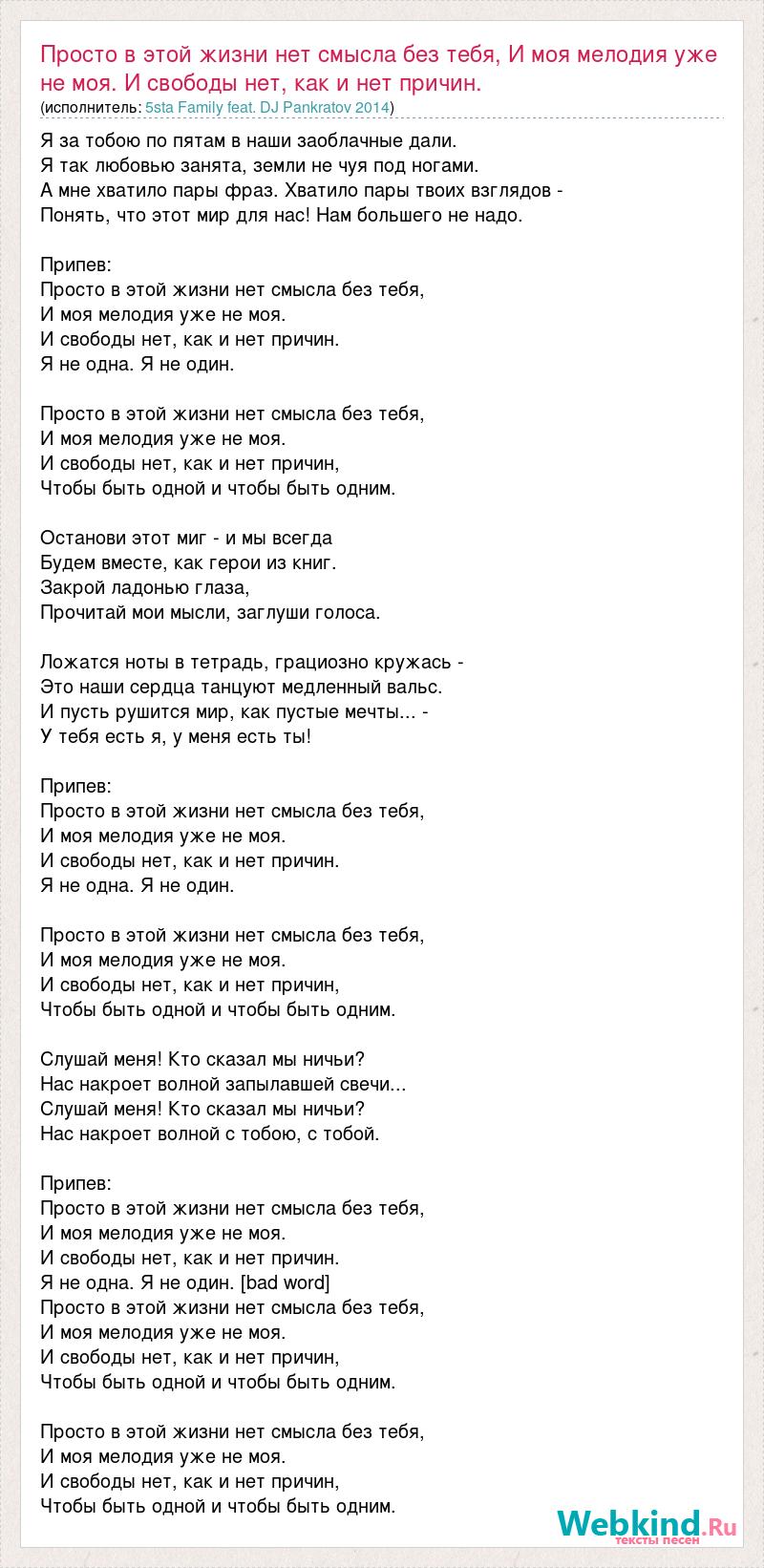 Главная→Исполнители→5sta Family feat. DJ Pankratov 2014→Просто в этой жизни нет смысла без тебя, И моя мелодия уже не моя. И