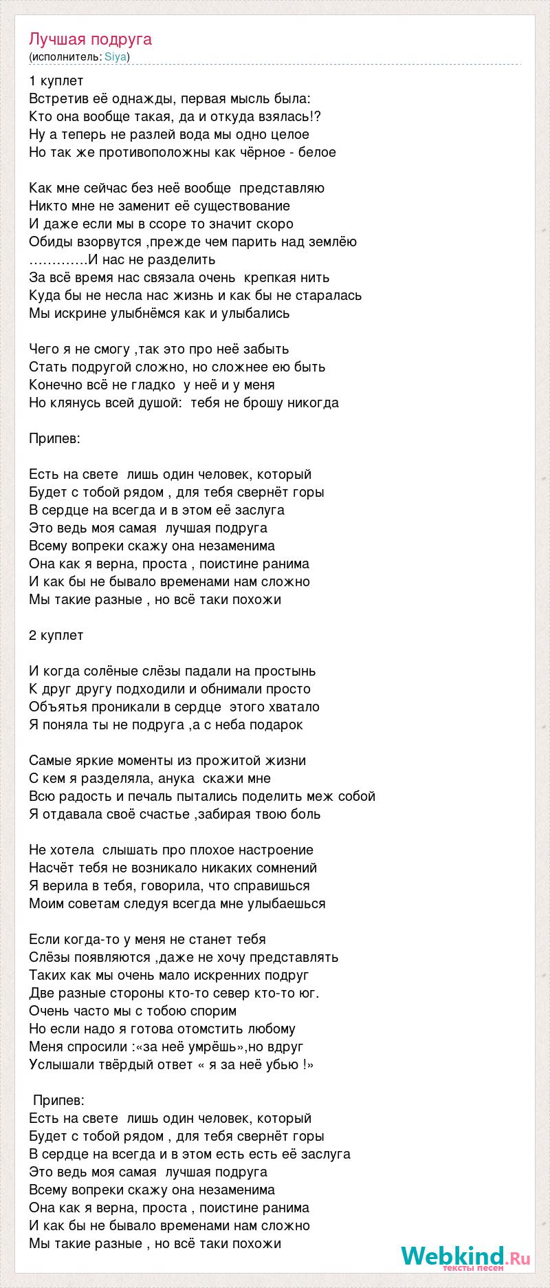 1 куплет Встретив её однажды, первая мысль была: Кто она вообще такая, да и откуда взялась!? Ну а теперь не разлей вода мы одно целое Но так же противоположны как чёрное - белое Как мне сейчас без неё вообще представляю Никто мне не заменит её существование И даже если мы в ссоре то значит скоро Обиды взорвутся ,прежде чем парить над землёю ………….И нас не разделить За всё время нас связала очень крепкая нить Куда бы не несла нас жизнь и как бы не старалась Мы искрине улыбнёмся как и улыбались Чего я не смогу ,так это про неё забыть Стать подругой сложно, но сложнее ею быть Конечно всё не гладко у неё и у меня Но клянусь всей душой: тебя не брошу никогда Припев: Есть на свете лишь один человек, который Будет с тобой рядом , для тебя свернёт горы В сердце на всегда и в этом её заслуга Это ведь моя самая лучшая подруга Всему вопреки скажу она незаменима Она как я верна, проста , поистине ранима И как бы не бывало временами нам сложно Мы такие разные , но всё таки похожи 2 куплет И когда солёные слёзы падали на простынь К друг другу подходили и обнимали просто Объятья проникали в сердце этого хватало Я поняла ты не подруга ,а с неба подарок Самые яркие моменты из прожитой жизни С кем я разделяла, анука скажи мне Всю радость и печаль пытались поделить меж собой Я отдавала своё счастье ,забирая твою боль Не хотела слышать про плохое настроение Насчёт тебя не возникало никаких сомнений Я верила в тебя, говорила, что справишься Моим советам следуя всегда мне улыбаешься Если когда-то у меня не станет тебя Слёзы появляются ,даже не хочу представлять Таких как мы очень мало искренних подруг Две разные стороны кто-то север кто-то юг. Очень часто мы с тобою спорим Но если надо я готова отомстить любому Меня спросили :«за неё умрёшь»,но вдруг Услышали твёрдый ответ « я за неё убью !» Припев: Есть на свете лишь один человек, который Будет с тобой рядом , для тебя свернёт горы В сердце на всегда и в этом есть есть её заслуга Это ведь моя самая лучшая подруга Всему вопреки скажу она незаменима Она как я верна, проста , поистине ранима И как бы не бывало временами нам сложно Мы такие разные , но всё таки похожи