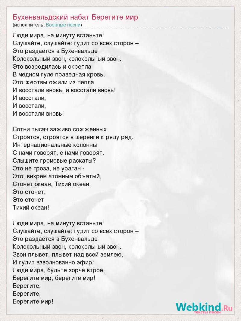 Люди мира, на минуту встаньте! Слушайте, слушайте: гудит со всех сторон – Это раздается в Бухенвальде Колокольный звон, колокольный звон. Это возродилась и окрепла В медном гуле праведная кровь. Это жертвы ожили из пепла И восстали вновь, и восстали вновь! И восстали, И восстали, И восстали вновь! Сотни тысяч заживо сожженных Строятся, строятся в шеренги к ряду ряд. Интернациональные колонны С нами говорят, с нами говорят. Слышите громовые раскаты? Это не гроза, не ураган - Это, вихрем атомным объятый, Стонет океан, Тихий океан. Это стонет, Это стонет Тихий океан! Люди мира, на минуту встаньте! Слушайте, слушайте: гудит со всех сторон – Это раздается в Бухенвальде Колокольный звон, колокольный звон. Звон плывет, плывет над всей землею, И гудит взволнованно эфир: Люди мира, будьте зорче втрое, Берегите мир, берегите мир! Берегите, Берегите, Берегите мир!
