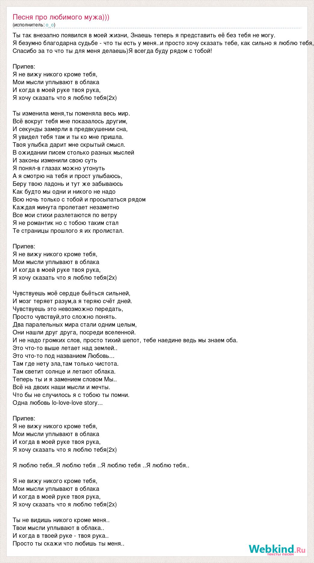 Ты так внезапно появился в моей жизни, Знаешь теперь я представить её без тебя не могу. Я безумно благодарна судьбе - что ты есть у меня..и просто хочу сказать тебе, как сильно я люблю тебя, Спасибо за то что ты для меня делаешь)Я всегда буду рядом с тобой! Припев: Я не вижу никого кроме тебя, Мои мысли уплывают в облака И когда в моей руке твоя рука, Я хочу сказать что я люблю тебя(2х) Ты изменила меня,ты поменяла весь мир. Всё вокруг тебя мне показалось другим, И секунды замерли в предвкушении сна, Я увидел тебя там и ты ко мне пришла. Твоя улыбка дарит мне скрытый смысл. В ожидании писем столько разных мыслей И законы изменили свою суть Я понял-в глазах можно утонуть А я смотрю на тебя и прост улыбаюсь, Беру твою ладонь и тут же забываюсь Как будто мы одни и никого не надо Всю ночь только с тобой и просыпаться рядом Каждая минута пролетает незаметно Все мои стихи разлетаются по ветру Я не романтик но с тобою таким стал Те страницы прошлого я их пролистал. Припев: Я не вижу никого кроме тебя, Мои мысли уплывают в облака И когда в моей руке твоя рука, Я хочу сказать что я люблю тебя(2х) Чувствуешь моё сердце бьёться сильней, И мозг теряет разум,а я теряю счёт дней. Чувствуешь это невозможно передать, Просто чувствуй,это сложно понять. Два паралельных мира стали одним целым, Они нашли друг друга, посреди вселенной. И не надо громких слов, просто тихий шепот, тебе наедине ведь мы знаем оба. Это что-то выше летает над землей.. Это что-то под названием Любовь... Там где нету зла,там только чистота. Там светит солнце и летают облака. Теперь ты и я замением словом Мы.. Всё на двоих наши мысли и мечты. Что бы не случилось я с тобою ты помни. Одна любовь lo-love-love story... Припев: Я не вижу никого кроме тебя, Мои мысли уплывают в облака И когда в моей руке твоя рука, Я хочу сказать что я люблю тебя(2х) Я люблю тебя..Я люблю тебя ..Я люблю тебя ..Я люблю тебя.. Я не вижу никого кроме тебя, Мои мысли уплывают в облака И когда в моей руке твоя рука, Я хочу сказать что я люблю тебя(2х) Ты не видишь никого кроме меня.. Твои мысли уплывают в облака.. И когда в твоей руке - твоя рука.. Просто ты скажи что любишь ты меня..