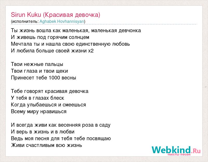 Ты жизнь вошла как маленькая, маленькая девчонка И живешь под горячим солнцем Мечтала ты и нашла свою единственную любовь И любила больше своей жизни х2 Твои нежные пальцы Твои глаза и твои щеки Принесет тебе 1000 весны Тебе говорят красивая девочка У тебя в глазах блеск Когда улыбаешься и смеешься Всему миру нравишься И всегда живи как весенняя роза в саду И верь в жизнь и в любви Ведь моя песня для тебя тебе посвящаю Живи счастливым всю жизнь