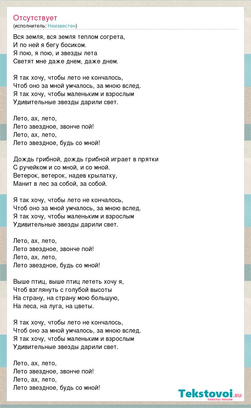 Вся земля, вся земля теплом согрета, И по ней я бегу босиком. Я пою, я пою, и звезды лета Светят мне даже днем, даже днем. Я так хочу, чтобы лето не кончалось, Чтоб оно за мной умчалось, за мною вслед. Я так хочу, чтобы маленьким и взрослым Удивительные звезды дарили свет. Лето, ах, лето, Лето звездное, звонче пой! Лето, ах, лето, Лето звездное, будь со мной! Дождь грибной, дождь грибной играет в прятки С ручейком и со мной, и со мной. Ветерок, ветерок, надев крылатку, Манит в лес за собой, за собой. Я так хочу, чтобы лето не кончалось, Чтоб оно за мной умчалось, за мною вслед. Я так хочу, чтобы маленьким и взрослым Удивительные звезды дарили свет. Лето, ах, лето, Лето звездное, звонче пой! Лето, ах, лето, Лето звездное, будь со мной! Выше птиц, выше птиц лететь хочу я, Чтоб взглянуть с голубой высоты На страну, на страну мою большую, На леса, на луга, на цветы. Я так хочу, чтобы лето не кончалось, Чтоб оно за мной умчалось, за мною вслед. Я так хочу, чтобы маленьким и взрослым Удивительные звезды дарили свет. Лето, ах, лето, Лето звездное, звонче пой! Лето, ах, лето, Лето звездное, будь со мной!