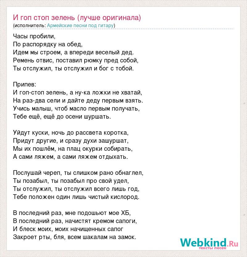 Часы пробили, По распорядку на обед, Идем мы строем, а впереди веселый дед. Ремень отвис, поставил рюмку пред собой, Ты отслужил, ты отслужил и бог с тобой. Припев: И гоп-стоп зелень, а ну-ка ложки не хватай, На раз-два сели и дайте деду первым взять. Учись малыш, чтоб масло первым получать, Тебе ещё, ещё до осени шуршать. Уйдут куски, ночь до рассвета коротка, Придут другие, и сразу духи зашуршат, Мы их пошлём, на плац окурки собирать, А сами ляжем, а сами ляжем отдыхать. Послушай череп, ты слишком рано обнаглел, Ты позабыл, ты позабыл про свой удел, Ты отслужил, ты отслужил всего лишь год, Тебе положен один лишь чистый кислород. В последний раз, мне подошьют мое ХБ, В последний раз, начистят кремом сапоги, И блеск моих, моих начищенных сапог Закроет рты, бля, всем шакалам на замок.