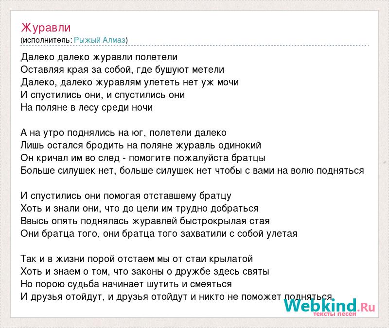 Далеко далеко журавли полетели Оставляя края за собой, где бушуют метели Далеко, далеко журавлям улететь нет уж мочи И спустились они, и спустились они На поляне в лесу среди ночи А на утро поднялись на юг, полетели далеко Лишь остался бродить на поляне журавль одинокий Он кричал им во след - помогите пожалуйста братцы Больше силушек нет, больше силушек нет чтобы с вами на волю подняться И спустились они помогая отставшему братцу Хоть и знали они, что до цели им трудно добраться Ввысь опять поднялась журавлей быстрокрылая стая Они братца того, они братца того захватили с собой улетая Так и в жизни порой отстаем мы от стаи крылатой Хоть и знаем о том, что законы о дружбе здесь святы Но порою судьба начинает шутить и смеяться И друзья отойдут, и друзья отойдут и никто не поможет подняться