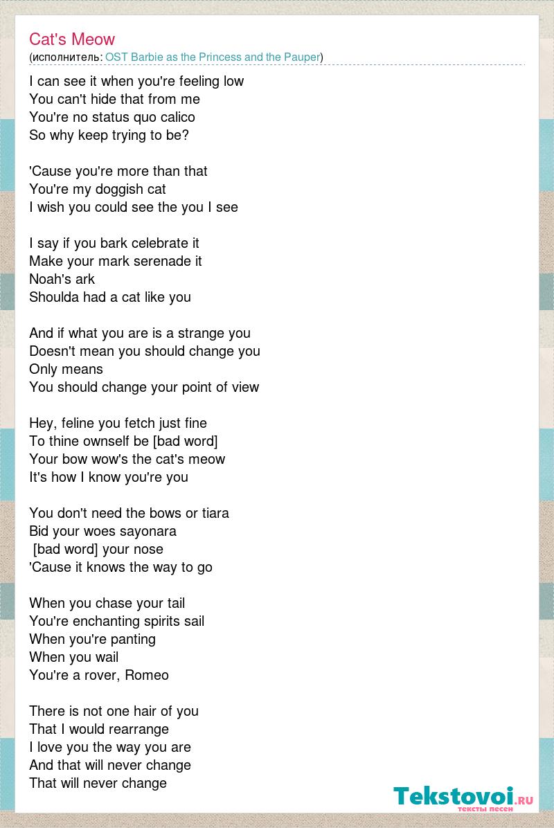 I can see it when you're feeling low You can't hide that from me You're no status quo calico So why keep trying to be? 'Cause you're more than that You're my doggish cat I wish you could see the you I see I say if you bark celebrate it Make your mark serenade it Noah's ark Shoulda had a cat like you And if what you are is a strange you Doesn't mean you should change you Only means You should change your point of view Hey, feline you fetch just fine To thine ownself be [bad word] Your bow wow's the cat's meow It's how I know you're you You don't need the bows or tiara Bid your woes sayonara [bad word] your nose 'Cause it knows the way to go When you chase your tail You're enchanting spirits sail When you're panting When you wail You're a rover, Romeo There is not one hair of you That I would rearrange I love you the way you are And that will never change That will never change