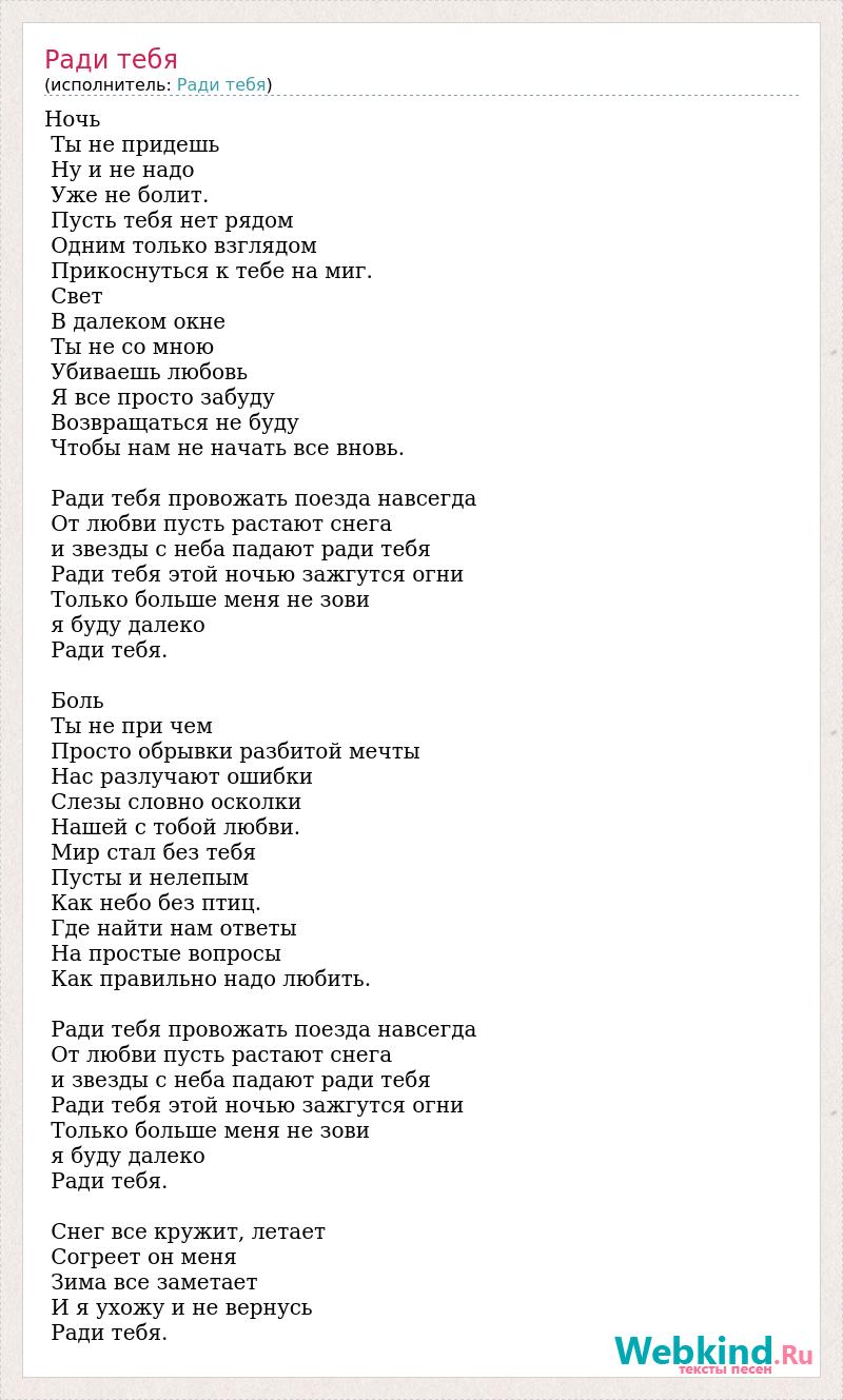 Ночь Ты не придешь Ну и не надо Уже не болит. Пусть тебя нет рядом Одним только взглядом Прикоснуться к тебе на миг. Свет В далеком окне Ты не со мною Убиваешь любовь Я все просто забуду Возвращаться не буду Чтобы нам не начать все вновь. Ради тебя провожать поезда навсегда От любви пусть растают снега и звезды с неба падают ради тебя Ради тебя этой ночью зажгутся огни Только больше меня не зови я буду далеко Ради тебя. Боль Ты не при чем Просто обрывки разбитой мечты Нас разлучают ошибки Слезы словно осколки Нашей с тобой любви. Мир стал без тебя Пусты и нелепым Как небо без птиц. Где найти нам ответы На простые вопросы Как правильно надо любить. Ради тебя провожать поезда навсегда От любви пусть растают снега и звезды с неба падают ради тебя Ради тебя этой ночью зажгутся огни Только больше меня не зови я буду далеко Ради тебя. Снег все кружит, летает Согреет он меня Зима все заметает И я ухожу и не вернусь Ради тебя.