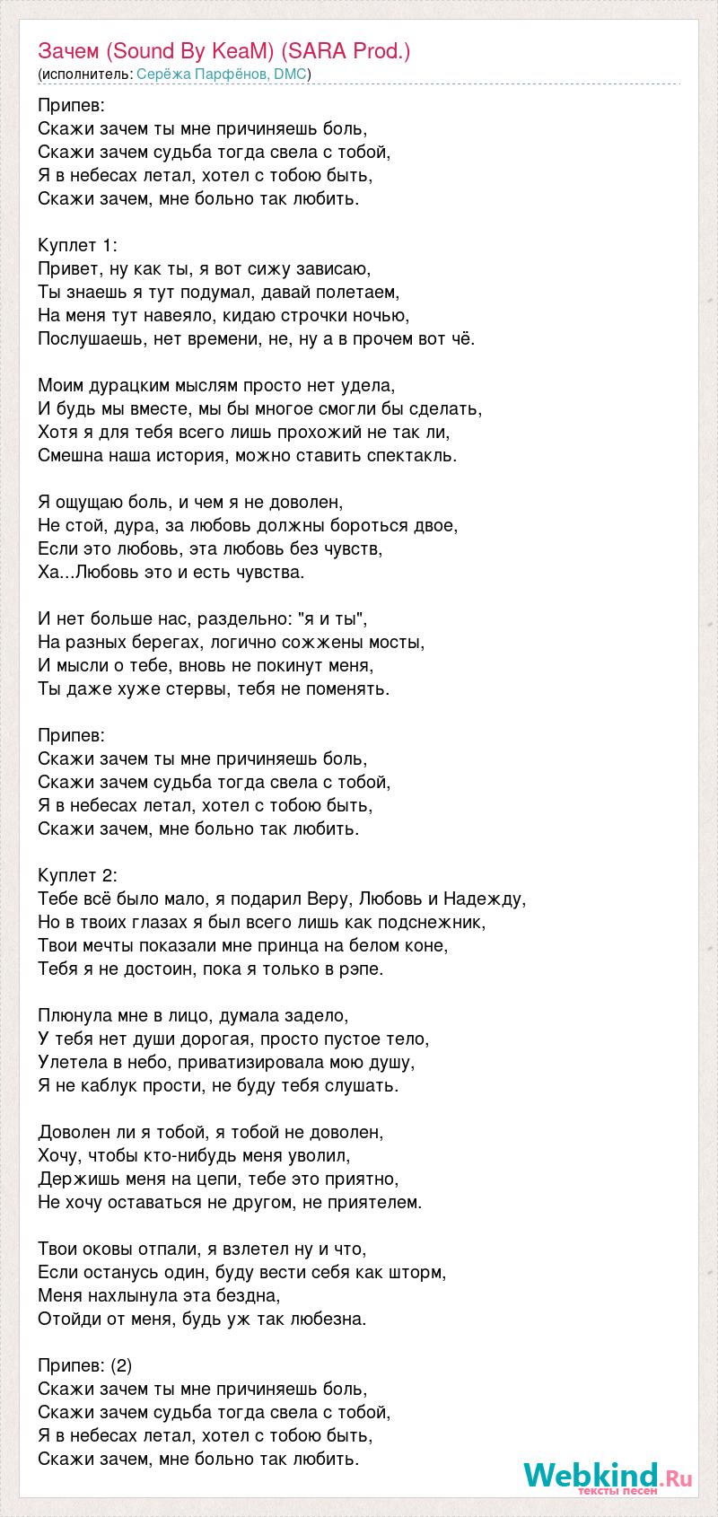 Припев: Скажи зачем ты мне причиняешь боль, Скажи зачем судьба тогда свела с тобой, Я в небесах летал, хотел с тобою быть, Скажи зачем, мне больно так любить. Куплет 1: Привет, ну как ты, я вот сижу зависаю, Ты знаешь я тут подумал, давай полетаем, На меня тут навеяло, кидаю строчки ночью, Послушаешь, нет времени, не, ну а в прочем вот чё. Моим дурацким мыслям просто нет удела, И будь мы вместе, мы бы многое смогли бы сделать, Хотя я для тебя всего лишь прохожий не так ли, Смешна наша история, можно ставить спектакль. Я ощущаю боль, и чем я не доволен, Не стой, дура, за любовь должны бороться двое, Если это любовь, эта любовь без чувств, Ха...Любовь это и есть чувства. И нет больше нас, раздельно: "я и ты", На разных берегах, логично сожжены мосты, И мысли о тебе, вновь не покинут меня, Ты даже хуже стервы, тебя не поменять. Припев: Скажи зачем ты мне причиняешь боль, Скажи зачем судьба тогда свела с тобой, Я в небесах летал, хотел с тобою быть, Скажи зачем, мне больно так любить. Куплет 2: Тебе всё было мало, я подарил Веру, Любовь и Надежду, Но в твоих глазах я был всего лишь как подснежник, Твои мечты показали мне принца на белом коне, Тебя я не достоин, пока я только в рэпе. Плюнула мне в лицо, думала задело, У тебя нет души дорогая, просто пустое тело, Улетела в небо, приватизировала мою душу, Я не каблук прости, не буду тебя слушать. Доволен ли я тобой, я тобой не доволен, Хочу, чтобы кто-нибудь меня уволил, Держишь меня на цепи, тебе это приятно, Не хочу оставаться не другом, не приятелем. Твои оковы отпали, я взлетел ну и что, Если останусь один, буду вести себя как шторм, Меня нахлынула эта бездна, Отойди от меня, будь уж так любезна. Припев: (2) Скажи зачем ты мне причиняешь боль, Скажи зачем судьба тогда свела с тобой, Я в небесах летал, хотел с тобою быть, Скажи зачем, мне больно так любить.