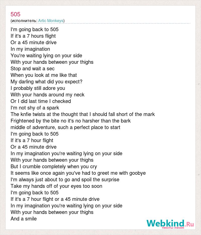I'm going back to 505 If it's a 7 hours flight Or a 45 minute drive In my imagination You're waiting lying on your side With your hands between your thighs Stop and wait a sec When you look at me like that My darling what did you expect? I probably still adore you With your hands around my neck Or I did last time I checked I'm not shy of a spark The knfie twists at the thought that I should fall short of the mark Frightened by the bite no it's no harsher than the bark middle of adventure, such a perfect place to start I'm going back to 505 If it's a 7 hour flight Or a 45 minute drive In my imagination you're waiting lying on your side With your hands between your thighs But I crumble completely when you cry It seems like once again you've had to greet me with goobye I'm always just about to go and spoil the surprise Take my hands off of your eyes too soon I'm going back to 505 If it's a 7 hour flight or a 45 minute drive In my imagination you're waiting lying on your side With your hands between your thighs And a smile