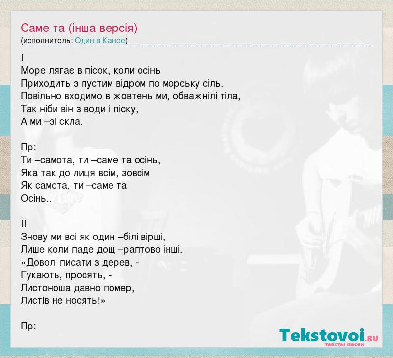 I Море лягає в пісок, коли осінь Приходить з пустим відром по морську сіль. Повільно входимо в жовтень ми, обважнілі тіла, Так ніби він з води і піску, А ми –зі скла. Пр: Ти –самота, ти –саме та осінь, Яка так до лиця всім, зовсім Як самота, ти –саме та Осінь.. II Знову ми всі як один –білі вірші, Лише коли паде дощ –раптово інші. «Доволі писати з дерев, - Гукають, просять, - Листоноша давно помер, Листів не носять!» Пр: