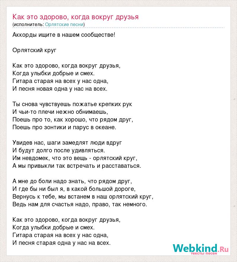 Аккорды ищите в нашем сообществе! Орлятский круг Как это здорово, когда вокруг друзья, Когда улыбки добрые и смех. Гитара старая на всех у нас одна, И песня новая одна у нас на всех. Ты снова чувствуешь пожатье крепких рук И чьи-то плечи нежно обнимаешь, Поешь про то, как хорошо, что рядом друг, Поешь про зонтики и парус в океане. Увидев нас, шаги замедлят люди вдруг И будут долго после удивляться. Им невдомек, что это вещь - орлятский круг, А мы привыкли так встречать и расставаться. А мне до боли надо знать, что рядом друг, И где бы ни был я, в какой большой дороге, Вернусь к тебе, мы встанем в наш орлятский круг, Ведь нам для счастья надо, право, так немного. Как это здорово, когда вокруг друзья, Когда улыбки добрые и смех. Гитара старая на всех у нас одна, И песня старая одна у нас на всех.
