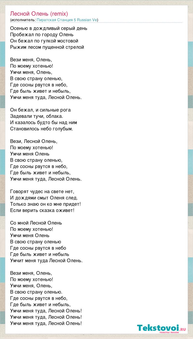 Осенью в дождливый серый день Пробежал по городу Олень Он бежал по гулкой мостовой Рыжим лесом пущенной стрелой Вези меня, Олень, По моему хотенью! Умчи меня, Олень, В свою страну оленью, Где сосны рвутся в небо, Где быль живет и небыль, Умчи меня туда, Лесной Олень. Он бежал, и сильные рога Задевали тучи, облака. И казалось будто бы над ним Становилось небо голубым. Вези, Лесной Олень, По моему хотенью! Умчи меня Олень В свою страну оленью, Где сосны рвутся в небо, Где быль живет и небыль, Умчи меня туда, Лесной Олень. Говорят чудес на свете нет, И дождями смыт Оленя след. Только знаю он ко мне придет! Если верить сказка оживет! Со мной Лесной Олень По моему хотенью! Умчи меня Олень В свою страну оленью Где сосны рвутся в небо Где быль живет и небыль Умчит меня туда Лесной Олень. Вези меня, Олень, По моему хотенью! Умчи меня, Олень, В свою страну оленью. Где сосны рвутся в небо, Где быль живет и небыль, Умчи меня туда, Лесной Олень! Умчи меня туда, Лесной Олень! Умчи меня туда, Лесной Олень!