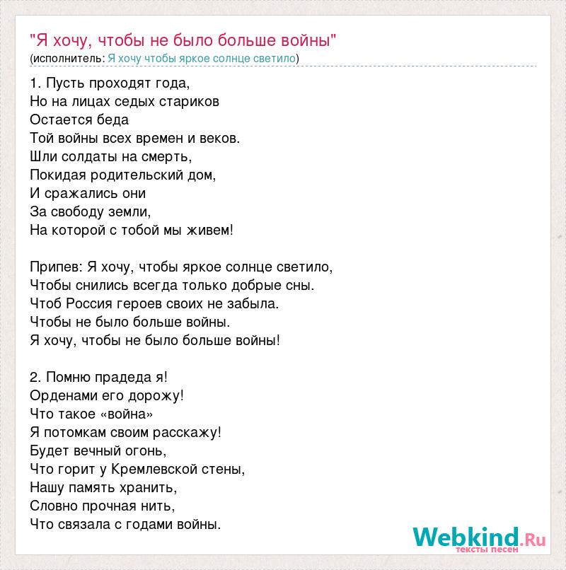 1. Пусть проходят года, Но на лицах седых стариков Остается беда Той войны всех времен и веков. Шли солдаты на смерть, Покидая родительский дом, И сражались они За свободу земли, На которой с тобой мы живем! Припев: Я хочу, чтобы яркое солнце светило, Чтобы снились всегда только добрые сны. Чтоб Россия героев своих не забыла. Чтобы не было больше войны. Я хочу, чтобы не было больше войны! 2. Помню прадеда я! Орденами его дорожу! Что такое «война» Я потомкам своим расскажу! Будет вечный огонь, Что горит у Кремлевской стены, Нашу память хранить, Словно прочная нить, Что связала с годами войны.