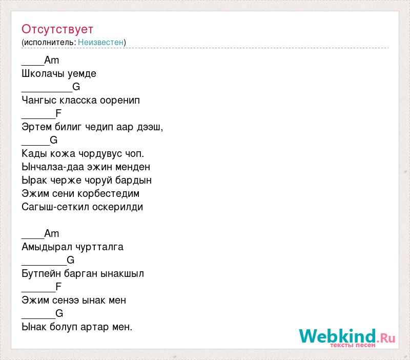 ____Am Школачы уемде _________G Чангыс класска ооренип ______F Эртем билиг чедип аар дээш, _____G Кады кожа чордувус чоп. Ынчалза-даа эжин менден Ырак черже чоруй бардын Эжим сени корбестедим Сагыш-сеткил оскерилди ____Am Амыдырал чуртталга ________G Бутпейн барган ынакшыл ______F Эжим сенээ ынак мен ______G Ынак болуп артар мен.