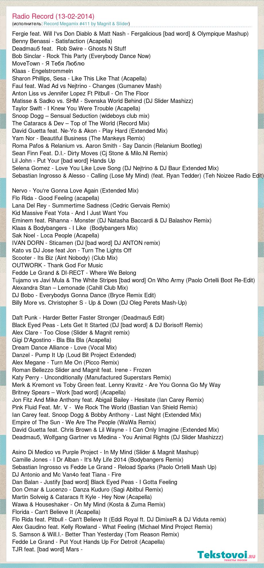 Fergie feat. Will I'vs Don Diablo & Matt Nash - Fergalicious (Krupa & Olympique Mashup) Benny Benassi - Satisfaction (Acapella) Deadmau5 feat. Rob Swire - Ghosts N Stuff Bob Sinclar - Rock This Party (Everybody Dance Now) MoveTown - Я Тебя Люблю Klaas - Engelstrommeln Sharon Phillips, Sesa - Like This Like That (Acapella) Faul feat. Wad Ad vs Nejtrino - Changes (Gumanev Mash) Anton Liss vs Jennifer Lopez Ft Pitbull - On The Floor Matisse & Sadko vs. SHM - Svenska World Behind (DJ Slider Mashizz) Taylor Swift - I Knew You Were Trouble (Acapella) Snoop Dogg – Sensual Seduction (wideboys club mix) The Cataracs & Dev – Top of The World (Record Mix) David Guetta feat. Ne-Yo & Akon - Play Hard (Extended Mix) Yam Nor - Beautiful Business (The Mankeys Remix) Roma Pafos & Relanium vs. Aaron Smith - Say Dancin (Relanium Bootleg) Sean Finn Feat. D.I.- Dirty Moves (Cj Stone & Milo.Nl Remix) Lil John - Put Your [bad word] Hands Up Selena Gomez - Love You Like Love Song (DJ Nejtrino & DJ Baur Extended Mix) Sebastian Ingrosso & Alesso - Calling (Lose My Mind) (feat. Ryan Tedder) (Teh Noizee Radio Edit) Nervo - You're Gonna Love Again (Extended Mix) Flo Rida - Good Feeling (acapella) Lana Del Rey - Summertime Sadness (Cedric Gervais Remix) Kid Massive Feat Yota - And I Just Want You Eminem feat. Rihanna - Monster (DJ Natasha Baccardi & DJ Balashov Remix) Klaas & Bodybangers - I Like (Bodybangers Mix) Sak Noel - Loca People (Acapella) IVAN DORN - Sticamen (DJ DENIS RUBLEV DJ ANTON remix) Kato vs DJ Jose feat Jon - Turn The Lights Off Scooter - Its Biz (Aint Nobody) (Club Mix) OUTWORK - Thank God For Music Fedde Le Grand & DI-RECT - Where We Belong Tujamo vs Javi Mula & The White Stripes - Come On Who Army (Paolo Ortelli Boot Re-Edit) Alexandra Stan – Lemonade (Cahill Club Mix) DJ Bobo - Everybodys Gonna Dance (Bryce Remix Edit) Billy More vs. Christopher S - Up & Down (DJ Oleg Perets Mash-Up) Daft Punk - Harder Better Faster Stronger (Deadmau5 Edit) Black Eyed Peas - Lets Get It Started (DJ Denis Rublev & DJ Borisoff Remix) Alex Clare - Too Close (Slider & Magnit remix) Gigi D'Agostino - Bla Bla Bla (Acapella) Dream Dance Alliance - Love (Vocal Mix) Danzel - Pump It Up (Loud Bit Project Extended) Alex Megane - Turn Me On (Picco Remix) Roman Bellezzo Slider and Magnit feat. Irene - Frozen Katy Perry - Unconditionally (Manufactured Superstars Remix) Merk & Kremont vs Toby Green feat. Lenny Kravitz - Are You Gonna Go My Way Britney Spears – Work [bad word] (Acapella) Jon Fitz And Mike Anthony feat. Abigail Bailey - Hesitate (Ian Carey Remix) Pink Fluid Feat. Mr. V - We Rock The World (Bastian Van Shield Remix) Ian Carey feat. Snoop Dogg & Bobby Anthony - Last Night (Extended Mix) Empire of The Sun - We Are The People (WaWa Remix) David Guetta feat. Chris Brown & Lil Wayne - I Can Only Imagine (Extended Mix) Deadmau5, Wolfgang Gartner vs Medina - You Animal Rights (DJ Slider Mashizzz) Asino Di Medico vs Purple Project - In My Mind (Slider & Magnit Mashup) Camille Jones - I Dr Alban - It's My Life 2014 (Bodybangers Remix) Sebastian Ingrosso vs Fedde Le Grand - Reload Sparks (Paolo Ortelli Mash Up) DJ Antonio and Mc Van4o feat Tiana - Fire Dan Balan - Justify [bad word] Black Eyed Peas - I Gotta Feeling Don Omar & Lucenzo - Danza Kuduro (Sagi Abitbul Remix) Martin Solveig & Cataracs ft Kyle - Hey Now (Acapella) Wawa & Houseshaker - On My Mind (Kosta & Zuma Remix) Florida - Can't Believe It (Acapella) Flo Rida feat. Pitbull - Can't Believe It (Eddi Royal ft. DJ DimixeR & DJ Viduta remix) Alex Gaudino feat. Kelly Rowland - What Feeling (Michael Mind Project Remix) S. Samson & Will.I.- Better Than Yesterday (Tom Reason Remix) Fedde Le Grand - Put Yout Hands Up For Detroit (Acapella) TJR feat. Bruno Mars -