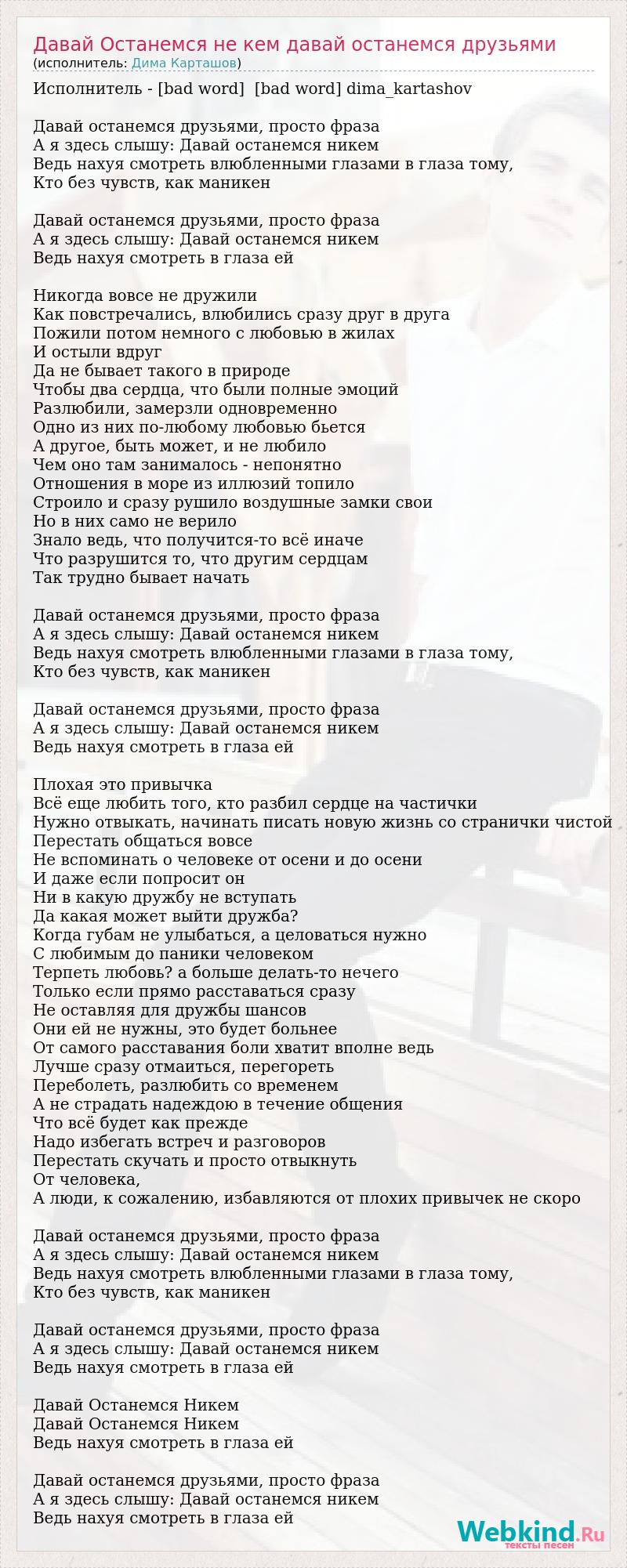 Исполнитель - [bad word] [bad word] dima_kartashov Давай останемся друзьями, просто фраза А я здесь слышу: Давай останемся никем Ведь нахуя смотреть влюбленными глазами в глаза тому, Кто без чувств, как маникен Давай останемся друзьями, просто фраза А я здесь слышу: Давай останемся никем Ведь нахуя смотреть в глаза ей Никогда вовсе не дружили Как повстречались, влюбились сразу друг в друга Пожили потом немного с любовью в жилах И остыли вдруг Да не бывает такого в природе Чтобы два сердца, что были полные эмоций Разлюбили, замерзли одновременно Одно из них по-любому любовью бьется А другое, быть может, и не любило Чем оно там занималось - непонятно Отношения в море из иллюзий топило Строило и сразу рушило воздушные замки свои Но в них само не верило Знало ведь, что получится-то всё иначе Что разрушится то, что другим сердцам Так трудно бывает начать Давай останемся друзьями, просто фраза А я здесь слышу: Давай останемся никем Ведь нахуя смотреть влюбленными глазами в глаза тому, Кто без чувств, как маникен Давай останемся друзьями, просто фраза А я здесь слышу: Давай останемся никем Ведь нахуя смотреть в глаза ей Плохая это привычка Всё еще любить того, кто разбил сердце на частички Нужно отвыкать, начинать писать новую жизнь со странички чистой Перестать общаться вовсе Не вспоминать о человеке от осени и до осени И даже если попросит он Ни в какую дружбу не вступать Да какая может выйти дружба? Когда губам не улыбаться, а целоваться нужно С любимым до паники человеком Терпеть любовь? а больше делать-то нечего Только если прямо расставаться сразу Не оставляя для дружбы шансов Они ей не нужны, это будет больнее От самого расставания боли хватит вполне ведь Лучше сразу отмаиться, перегореть Переболеть, разлюбить со временем А не страдать надеждою в течение общения Что всё будет как прежде Надо избегать встреч и разговоров Перестать скучать и просто отвыкнуть От человека, А люди, к сожалению, избавляются от плохих привычек не скоро Давай останемся друзьями, просто фраза А я здесь слышу: Давай останемся никем Ведь нахуя смотреть влюбленными глазами в глаза тому, Кто без чувств, как маникен Давай останемся друзьями, просто фраза А я здесь слышу: Давай останемся никем Ведь нахуя смотреть в глаза ей Давай Останемся Никем Давай Останемся Никем Ведь нахуя смотреть в глаза ей Давай останемся друзьями, просто фраза А я здесь слышу: Давай останемся никем Ведь нахуя смотреть в глаза ей