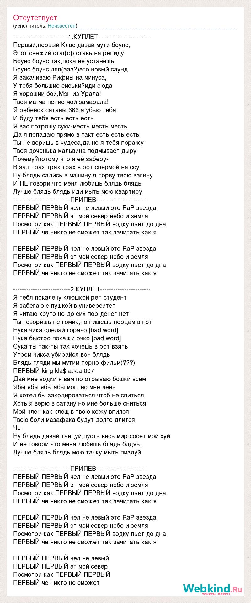 -------------------------1.КУПЛЕТ ----------------------- Первый,первый Клас давай мути боунс, Этот свежий стафф,ставь на репиду Боунс боунс так,пока не устанешь Боунс боунс ляп(ааа?)это новый саунд Я закачиваю Рифмы на минуса, У тебя большие сиськи?иди сюда Я хороший бой,Мэн из Урала! Твоя ма-ма пенис мой замарала! Я ребенок сатаны 666,я убью тебя И буду тебя есть есть есть Я вас потрошу суки-месть месть месть Да я попадаю прямо в такт есть есть есть Ты не веришь в чудеса,да но я тебя поражу Твоя доченька мальвина подмывает дыру Почему?потому что я её заберу- В зад трах трах трах в рот спермой на ссу Ну блядь садись в машину,я порву твою вагину И НЕ говори что меня любишь блядь блядь Лучше блядь блядь иди мыть мою квартиру --------------------------ПРИПЕВ----------------------- ПЕРВЫЙ ПЕРВЫЙ чел не левый это RaP звезда ПЕРВЫЙ ПЕРВЫЙ эт мой север небо и земля Посмотри как ПЕРВЫЙ ПЕРВЫЙ водку пьет до дна ПЕРВЫЙ че никто не сможет так зачитать как я ПЕРВЫЙ ПЕРВЫЙ чел не левый это RaP звезда ПЕРВЫЙ ПЕРВЫЙ эт мой север небо и земля Посмотри как ПЕРВЫЙ ПЕРВЫЙ водку пьет до дна ПЕРВЫЙ че никто не сможет так зачитать как я --------------------------2.КУПЛЕТ----------------------- Я тебя покалечу клюшкой реп студент Я забегаю с пушкой в университет Я читаю круто но-до сих пор денег нет Ты говоришь не гомик,но пишешь перцам в нэт Нука чика сделай горячо [bad word] Нука быстро покажи очко [bad word] Сука ты так-ты так хочешь в рот взять Утром чикса убирайся вон блядь Блядь гляди мы мутим порно фильм(???) ПЕРВЫЙ king kla$ a.k.a 007 Дай мне водки я вам по отрываю бошки всем Ябы ябы ябы ябы мог. но мне лень Я хотел бы закодироваться чтоб не спиться Хоть я верю в сатану но мне больше сниться Мой член как клещ в твою кожу впился Твою боли мазафака будут долго длится Че Ну блядь давай танцуй,пусть весь мир сосет мой хуй И не говори что меня любишь блядь блдяь, Лучше блядь блядь мою тачку мыть пиздуй --------------------------ПРИПЕВ----------------------- ПЕРВЫЙ ПЕРВЫЙ чел не левый это RaP звезда ПЕРВЫЙ ПЕРВЫЙ эт мой север небо и земля Посмотри как ПЕРВЫЙ ПЕРВЫЙ водку пьет до дна ПЕРВЫЙ че никто не сможет так зачитать как я ПЕРВЫЙ ПЕРВЫЙ чел не левый это RaP звезда ПЕРВЫЙ ПЕРВЫЙ эт мой север небо и земля Посмотри как ПЕРВЫЙ ПЕРВЫЙ водку пьет до дна ПЕРВЫЙ че никто не сможет так зачитать как я ПЕРВЫЙ ПЕРВЫЙ чел не левый ПЕРВЫЙ ПЕРВЫЙ эт мой север Посмотри как ПЕРВЫЙ ПЕРВЫЙ ПЕРВЫЙ че никто не сможет