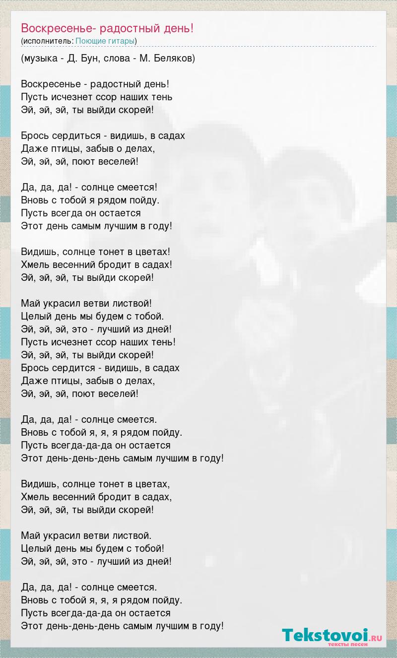 (музыка - Д. Бун, слова - М. Беляков) Воскресенье - радостный день! Пусть исчезнет ссор наших тень Эй, эй, эй, ты выйди скорей! Брось сердиться - видишь, в садах Даже птицы, забыв о делах, Эй, эй, эй, поют веселей! Да, да, да! - солнце смеется! Вновь с тобой я рядом пойду. Пусть всегда он остается Этот день самым лучшим в году! Видишь, солнце тонет в цветах! Хмель весенний бродит в садах! Эй, эй, эй, ты выйди скорей! Май украсил ветви листвой! Целый день мы будем с тобой. Эй, эй, эй, это - лучший из дней! Пусть исчезнет ссор наших тень! Эй, эй, эй, ты выйди скорей! Брось сердится - видишь, в садах Даже птицы, забыв о делах, Эй, эй, эй, поют веселей! Да, да, да! - солнце смеется. Вновь с тобой я, я, я рядом пойду. Пусть всегда-да-да он остается Этот день-день-день самым лучшим в году! Видишь, солнце тонет в цветах, Хмель весенний бродит в садах, Эй, эй, эй, ты выйди скорей! Май украсил ветви листвой. Целый день мы будем с тобой! Эй, эй, эй, это - лучший из дней! Да, да, да! - солнце смеется. Вновь с тобой я, я, я рядом пойду. Пусть всегда-да-да он остается Этот день-день-день самым лучшим в году!