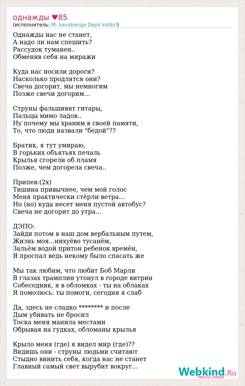 Однажды нас не станет, А надо ли нам спешить? Рассудок туманен.. Обменяв себя на миражи Куда нас носили дороги? Насколько продлятся они? Свеча догорит, мы немногим Позже свечи догорим… Струны фальшивят гитары, Пальцы мимо ладов.. Ну почему мы храним в своей памяти, То, что люди назвали "бедой"?? Братик, я тут умираю, В горьких объятьях печаль Крылья сгорели об пламя Позже, чем догорела свеча.. Припев:(2х) Тишина привычнее, чем мой голос Меня практически стёрли ветра… Но (но) куда несет меня пустой автобус? Свеча не догорит до утра… ДЭПО: Зайди потом в наш дом вербальным путем, Жизнь моя...нихуёво тусанём, Зальём водой притон ребенок времён, Я проспал ведь некому было спасать же Мы так любим, что любит Боб Марли В глазах трамплин утонул в городе витрин Собеседник, я в обломках - ты на облаках Я помолюсь: ты помоги, сегодня я слаб Да, здесь не сладко ******** и после Дым убивать не бросил Тоска меня манила местами Обрывая на гудках, обломаны крылья Крыло меня (где) я видел мир (где)?? Видишь они - струны людьми считают Стыдно винить себя, когда нас не станет Главный самый свет вырубит вокруг...