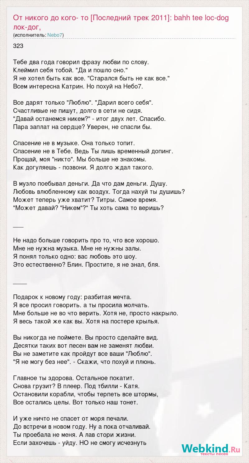 323 Тебе два года говорил фразу любви по слову. Клеймил себя тобой. "Да и пошло оно." Я не хотел быть как все. "Старался быть не как все." Всем интересна Катрин. Но похуй на Небо7. Все дарят только "Люблю". "Дарил всего себя". Счастливые не пишут, долго в сети не сидя. "Давай останемся никем?" - итог двух лет. Спасибо. Пара заплат на сердце? Уверен, не спасли бы. Спасение не в музыке. Она только топит. Спасение не в Тебе. Ведь Ты лишь временный допинг. Прощай, моя "никто". Мы больше не знакомы. Как догуляешь - позвони. Я долго ждал такого. В музло поебывал деньги. Да что дам деньги. Душу. Любовь влюбленному как воздух. Тогда нахуй ты душишь? Может теперь уже хватит? Титры. Самое время. "Может давай? "Никем"?" Ты хоть сама то веришь? ___ Не надо больше говорить про то, что все хорошо. Мне не нужна музыка. Мне не нужны залы. Я понял только одно: вас любовь это шоу. Это естественно? Блин. Простите, я не знал, бля. ____ Подарок к новому году: разбитая мечта. Я все просил говорить. а ты просила молчать. Мне больше не во что верить. Хотя не, просто накрыло. Я весь такой же как вы. Хотя на постере крылья. Вы никогда не поймете. Вы просто сделайте вид. Десятки таких вот песен вам не заменят любви. Вы не заметите как пройдут все ваши "Люблю". "Я не могу без нее". - Скажи, что похуй и плюнь. Главное ты здорова. Остальное покатит. Снова грузит? В плеер. Под тбилли - Катя. Остановили корабли, чтобы терпеть все штормы, Все остались целы. Вот только наш тонет. И уже ничто не спасет от моря печали. До встречи в новом году. Ну а пока отчаливай. Ты проебала не меня. А лав стори жизни. Если захочешь - уйду. НО не смогу исчезнуть