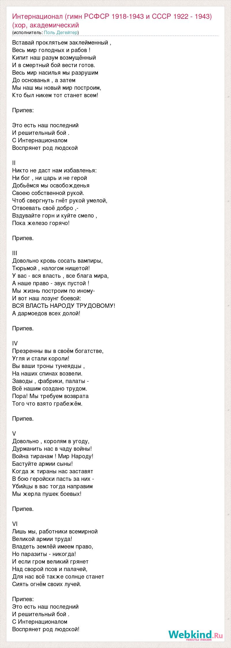 Вставай проклятьем заклейменный , Весь мир голодных и рабов ! Кипит наш разум возмущённый И в смертный бой вести готов. Весь мир насилья мы разрушим До основанья , а затем Мы наш мы новый мир построим, Кто был никем тот станет всем! Припев: Это есть наш последний И решительный бой . С Интернационалом Воспрянет род людской II Никто не даст нам избавленья: Ни бог , ни царь и не герой Добьёмся мы освобожденья Своею собственной рукой. Чтоб свергнуть гнёт рукой умелой, Отвоевать своё добро ,- Вздувайте горн и куйте смело , Пока железо горячо! Припев. III Довольно кровь сосать вампиры, Тюрьмой , налогом нищетой! У вас - вся власть , все блага мира, А наше право - звук пустой ! Мы жизнь построим по иному- И вот наш лозунг боевой: ВСЯ ВЛАСТЬ НАРОДУ ТРУДОВОМУ! А дармоедов всех долой! Припев. IV Презренны вы в своём богатстве, Угля и стали короли! Вы ваши троны тунеядцы , На наших спинах возвели. Заводы , фабрики, палаты - Всё нашим создано трудом. Пора! Мы требуем возврата Того что взято грабежём. Припев. V Довольно , королям в угоду, Дурманить нас в чаду войны! Война тиранам ! Мир Народу! Бастуйте армии сыны! Когда ж тираны нас заставят В бою геройски пасть за них - Убийцы в вас тогда направим Мы жерла пушек боевых! Припев. VI Лишь мы, работники всемирной Великой армии труда! Владеть землёй имеем право, Но паразиты - никогда! И если гром великий грянет Над сворой псов и палачей, Для нас всё также солнце станет Сиять огнём своих лучей. Припев: Это есть наш последний И решительный бой . С Интернационалом Воспрянет род людской!