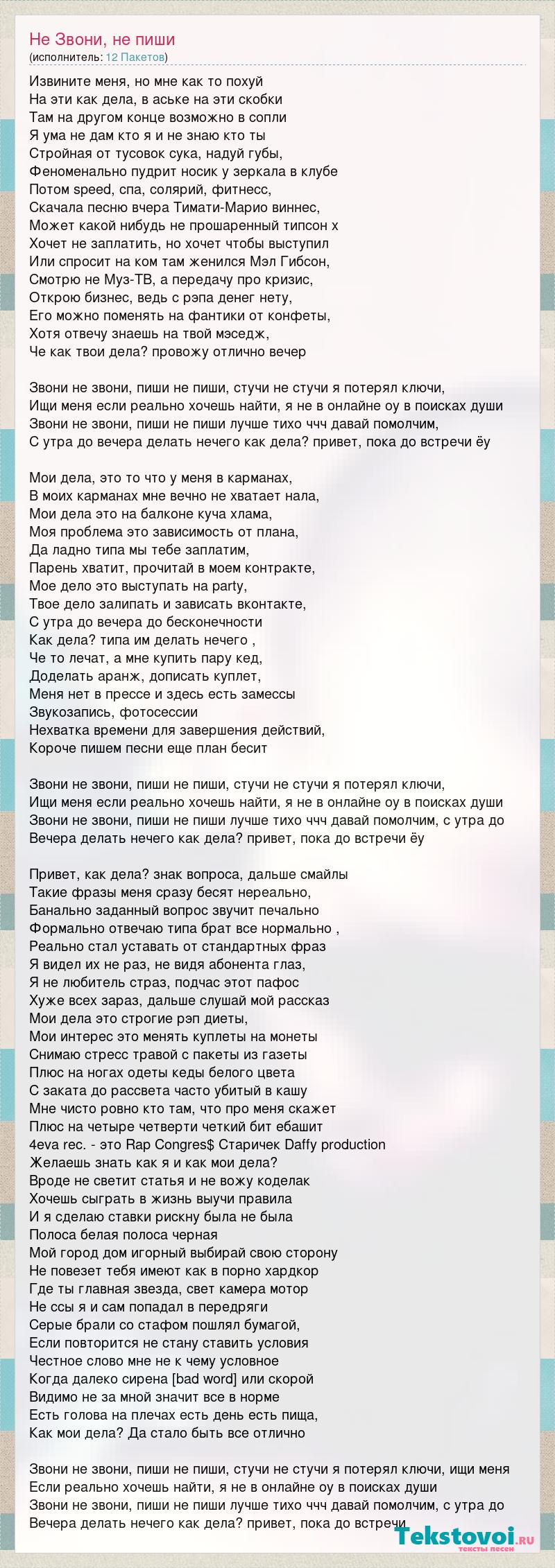 Извините меня, но мне как то похуй На эти как дела, в аське на эти скобки Там на другом конце возможно в сопли Я ума не дам кто я и не знаю кто ты Стройная от тусовок сука, надуй губы, Феноменально пудрит носик у зеркала в клубе Потом speed, спа, солярий, фитнесс, Скачала песню вчера Тимати-Марио виннес, Может какой нибудь не прошаренный типсон х Хочет не заплатить, но хочет чтобы выступил Или спросит на ком там женился Мэл Гибсон, Смотрю не Муз-ТВ, а передачу про кризис, Открою бизнес, ведь с рэпа денег нету, Его можно поменять на фантики от конфеты, Хотя отвечу знаешь на твой мэседж, Че как твои дела? провожу отлично вечер Звони не звони, пиши не пиши, стучи не стучи я потерял ключи, Ищи меня если реально хочешь найти, я не в онлайне оу в поисках души Звони не звони, пиши не пиши лучше тихо ччч давай помолчим, С утра до вечера делать нечего как дела? привет, пока до встречи ёу Мои дела, это то что у меня в карманах, В моих карманах мне вечно не хватает нала, Мои дела это на балконе куча хлама, Моя проблема это зависимость от плана, Да ладно типа мы тебе заплатим, Парень хватит, прочитай в моем контракте, Мое дело это выступать на party, Твое дело залипать и зависать вконтакте, С утра до вечера до бесконечности Как дела? типа им делать нечего , Че то лечат, а мне купить пару кед, Доделать аранж, дописать куплет, Меня нет в прессе и здесь есть замессы Звукозапись, фотосессии Нехватка времени для завершения действий, Короче пишем песни еще план бесит Звони не звони, пиши не пиши, стучи не стучи я потерял ключи, Ищи меня если реально хочешь найти, я не в онлайне оу в поисках души Звони не звони, пиши не пиши лучше тихо ччч давай помолчим, с утра до Вечера делать нечего как дела? привет, пока до встречи ёу Привет, как дела? знак вопроса, дальше смайлы Такие фразы меня сразу бесят нереально, Банально заданный вопрос звучит печально Формально отвечаю типа брат все нормально , Реально стал уставать от стандартных фраз Я видел их не раз, не видя абонента глаз, Я не любитель страз, подчас этот пафос Хуже всех зараз, дальше слушай мой рассказ Мои дела это строгие рэп диеты, Мои интерес это менять куплеты на монеты Снимаю стресс травой с пакеты из газеты Плюс на ногах одеты кеды белого цвета С заката до рассвета часто убитый в кашу Мне чисто ровно кто там, что про меня скажет Плюс на четыре четверти четкий бит ебашит 4eva rec. - это Rap Congres$ Старичек Daffy production Желаешь знать как я и как мои дела? Вроде не светит статья и не вожу коделак Хочешь сыграть в жизнь выучи правила И я сделаю ставки рискну была не была Полоса белая полоса черная Мой город дом игорный выбирай свою сторону Не повезет тебя имеют как в порно хардкор Где ты главная звезда, свет камера мотор Не ссы я и сам попадал в передряги Серые брали со стафом пошлял бумагой, Если повторится не стану ставить условия Честное слово мне не к чему условное Когда далеко сирена [bad word] или скорой Видимо не за мной значит все в норме Есть голова на плечах есть день есть пища, Как мои дела? Да стало быть все отлично Звони не звони, пиши не пиши, стучи не стучи я потерял ключи, ищи меня Если реально хочешь найти, я не в онлайне оу в поисках души Звони не звони, пиши не пиши лучше тихо ччч давай помолчим, с утра до Вечера делать нечего как дела? привет, пока до встречи