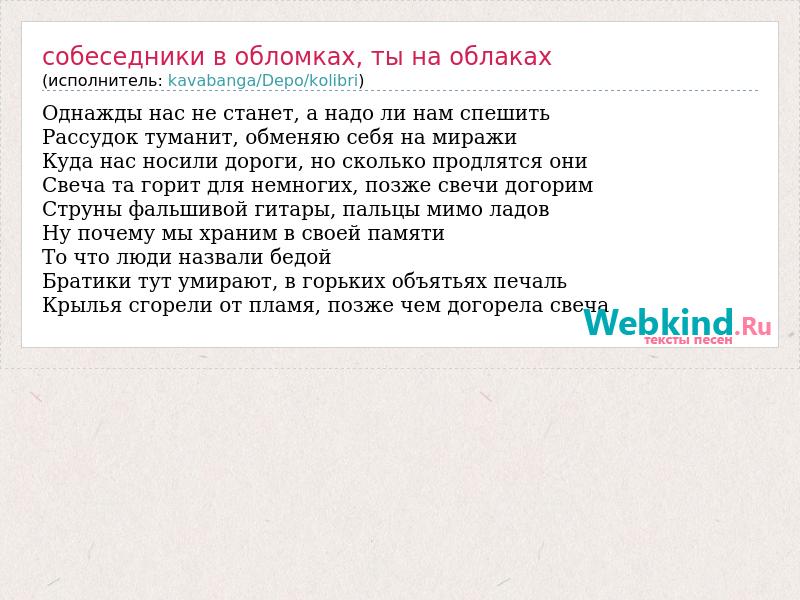 Однажды нас не станет, а надо ли нам спешить Рассудок туманит, обменяю себя на миражи Куда нас носили дороги, но сколько продлятся они Свеча та горит для немногих, позже свечи догорим Струны фальшивой гитары, пальцы мимо ладов Ну почему мы храним в своей памяти То что люди назвали бедой Братики тут умирают, в горьких объятьях печаль Крылья сгорели от пламя, позже чем догорела свеча