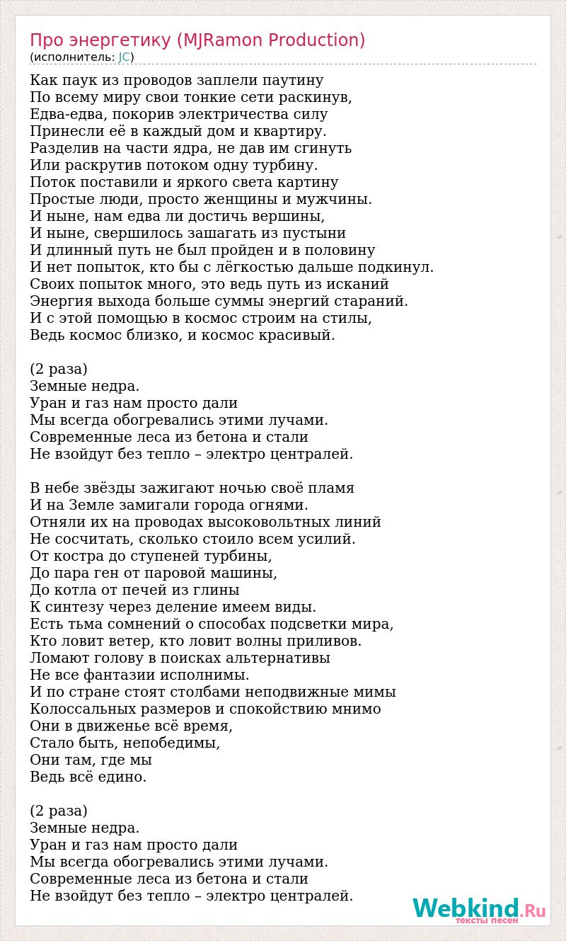 Как паук из проводов заплели паутину По всему миру свои тонкие сети раскинув, Едва-едва, покорив электричества силу Принесли её в каждый дом и квартиру. Разделив на части ядра, не дав им сгинуть Или раскрутив потоком одну турбину. Поток поставили и яркого света картину Простые люди, просто женщины и мужчины. И ныне, нам едва ли достичь вершины, И ныне, свершилось зашагать из пустыни И длинный путь не был пройден и в половину И нет попыток, кто бы с лёгкостью дальше подкинул. Своих попыток много, это ведь путь из исканий Энергия выхода больше суммы энергий стараний. И с этой помощью в космос строим на стилы, Ведь космос близко, и космос красивый. (2 раза) Земные недра. Уран и газ нам просто дали Мы всегда обогревались этими лучами. Современные леса из бетона и стали Не взойдут без тепло – электро централей. В небе звёзды зажигают ночью своё пламя И на Земле замигали города огнями. Отняли их на проводах высоковольтных линий Не сосчитать, сколько стоило всем усилий. От костра до ступеней турбины, До пара ген от паровой машины, До котла от печей из глины К синтезу через деление имеем виды. Есть тьма сомнений о способах подсветки мира, Кто ловит ветер, кто ловит волны приливов. Ломают голову в поисках альтернативы Не все фантазии исполнимы. И по стране стоят столбами неподвижные мимы Колоссальных размеров и спокойствию мнимо Они в движенье всё время, Стало быть, непобедимы, Они там, где мы Ведь всё едино. (2 раза) Земные недра. Уран и газ нам просто дали Мы всегда обогревались этими лучами. Современные леса из бетона и стали Не взойдут без тепло – электро централей.