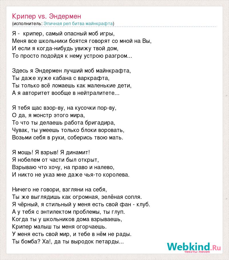 Я - крипер, самый опасный моб игры, Меня все школьники боятся говорят со мной на Вы, И если я когда-нибудь увижу твой дом, То просто подойдя к нему устрою разгром... Здесь я Эндермен лучший моб майнкрафта, Ты даже хуже кабана с варкрафта, Ты только всё ломаешь как маленькие дети, А я авторитет вообще в нейтралитете... Я тебя щас взор-ву, на кусочки пор-ву, О да, я монстр этого мира, То что ты делаешь работа бригадира, Чувак, ты умеешь только блоки воровать, Возьми себя в руки, соберись твою мать. Я мощь! Я взрыв! Я динамит! Я нобелем от части был открыт, Взрываю что хочу, на право и налево, И никто не указ мне даже чья-то королева. Ничего не говори, взгляни на себя, Ты же выглядишь как огромная, зелёная сопля. Я чёрный, я стильный у меня есть свой фан - клуб. А у тебя с энтилектом проблемы, ты глуп. Когда ты у школьников дома взрываешь, Крипер малыш ты меня огорчаешь. У меня есть свой мир, и тебе в нём не рады. Ты бомба? Ха!, да ты выродок петарды...