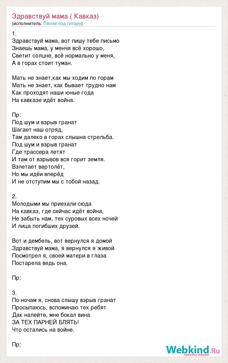 1. Здравствуй мама, вот пишу тебе письмо Знаешь мама, у менчя всё хорошо, Светит солцне, всё нормально у меня, А в горах стоит туман. Мать не знает,как мы ходим по горам Мать не знает, как бывает трудно нам Как проходят наши юные года На кавказе идёт война. Пр: Под шум и взрыв гранат Шагает наш отряд, Там далеко в горах слышна стрельба. Под шум и взрыв гранат Где трассера летят И там от взрывов вся горит земля. Взлетает вертолёт, Но мы идёи вперёд И не отступим мы с тобой назад. 2. Молодыми мы приехали сюда На кавказ, где сейчас идёт война, Не забыть нам, тех суровых всех ночей И лица погибших друзей. Вот и дембель, вот вернулся я домой Здравствуй мама, я вернулся я живой Посмотрел я, своей матери в глаза Постарела ведь она. Пр: 3. По ночам я, снова слышу взрыв гранат Просыпаюсь, вспоминаю тех ребят Дак налейте, мне бокал вина ЗА ТЕХ ПАРНЕЙ БЛЯТЬ! Что остались на войне. Пр: