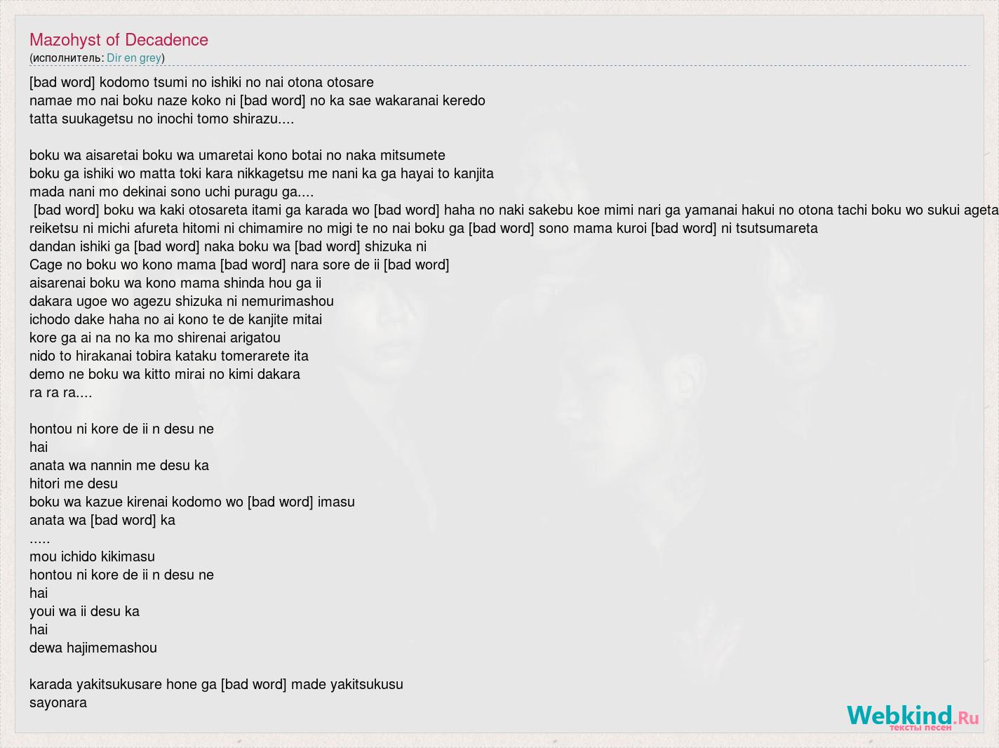 [bad word] kodomo tsumi no ishiki no nai otona otosare namae mo nai boku naze koko ni [bad word] no ka sae wakaranai keredo tatta suukagetsu no inochi tomo shirazu.... boku wa aisaretai boku wa umaretai kono botai no naka mitsumete boku ga ishiki wo matta toki kara nikkagetsu me nani ka ga hayai to kanjita mada nani mo dekinai sono uchi puragu ga.... [bad word] boku wa kaki otosareta itami ga karada wo [bad word] haha no naki sakebu koe mimi nari ga yamanai hakui no otona tachi boku wo sukui ageta reiketsu ni michi afureta hitomi ni chimamire no migi te no nai boku ga [bad word] sono mama kuroi [bad word] ni tsutsumareta dandan ishiki ga [bad word] naka boku wa [bad word] shizuka ni Cage no boku wo kono mama [bad word] nara sore de ii [bad word] aisarenai boku wa kono mama shinda hou ga ii dakara ugoe wo agezu shizuka ni nemurimashou ichodo dake haha no ai kono te de kanjite mitai kore ga ai na no ka mo shirenai arigatou nido to hirakanai tobira kataku tomerarete ita demo ne boku wa kitto mirai no kimi dakara ra ra ra.... hontou ni kore de ii n desu ne hai anata wa nannin me desu ka hitori me desu boku wa kazue kirenai kodomo wo [bad word] imasu anata wa [bad word] ka ..... mou ichido kikimasu hontou ni kore de ii n desu ne hai youi wa ii desu ka hai dewa hajimemashou karada yakitsukusare hone ga [bad word] made yakitsukusu sayonara