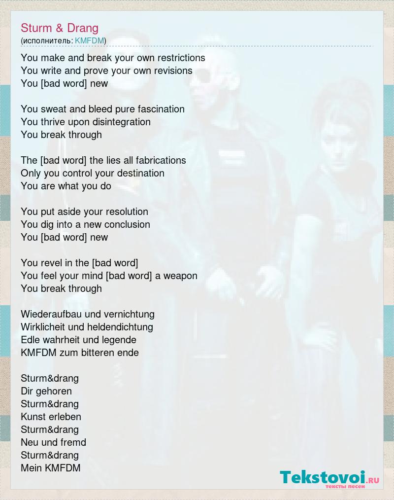 You make and break your own restrictions You write and prove your own revisions You become new You sweat and bleed pure fascination You thrive upon disintegration You break through The truth the lies all fabrications Only you control your destination You are what you do You put aside your resolution You dig into a new conclusion You become new You revel in the de-construction You feel your mind become a weapon You break through Wiederaufbau und vernichtung Wirklicheit und heldendichtung Edle wahrheit und legende KMFDM zum bitteren ende Sturm&drang Dir gehoren Sturm&drang Kunst erleben Sturm&drang Neu und fremd Sturm&drang Mein KMFDM