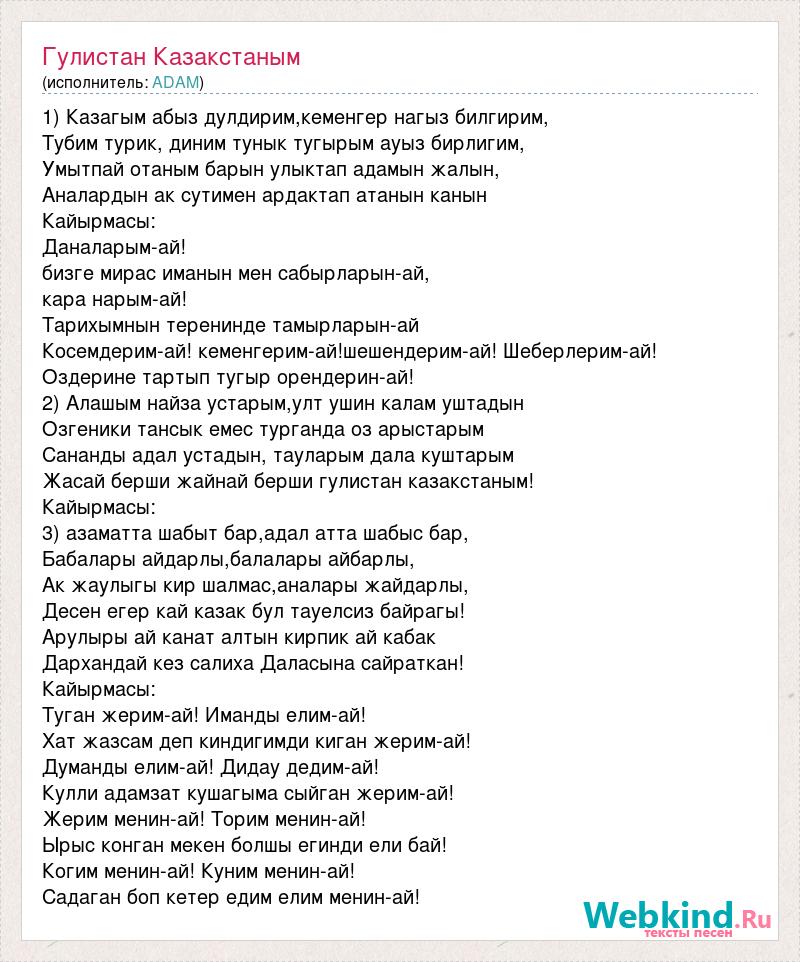 1) Казагым абыз дулдирим,кеменгер нагыз билгирим, Тубим турик, диним тунык тугырым ауыз бирлигим, Умытпай отаным барын улыктап адамын жалын, Аналардын ак сутимен ардактап атанын канын Кайырмасы: Даналарым-ай! бизге мирас иманын мен сабырларын-ай, кара нарым-ай! Тарихымнын теренинде тамырларын-ай Косемдерим-ай! кеменгерим-ай!шешендерим-ай! Шеберлерим-ай! Оздерине тартып тугыр орендерин-ай! 2) Алашым найза устарым,улт ушин калам уштадын Озгеники тансык емес турганда оз арыстарым Сананды адал устадын, тауларым дала куштарым Жасай берши жайнай берши гулистан казакстаным! Кайырмасы: 3) азаматта шабыт бар,адал атта шабыс бар, Бабалары айдарлы,балалары айбарлы, Ак жаулыгы кир шалмас,аналары жайдарлы, Десен егер кай казак бул тауелсиз байрагы! Арулыры ай канат алтын кирпик ай кабак Дархандай кез салиха Даласына сайраткан! Кайырмасы: Туган жерим-ай! Иманды елим-ай! Хат жазсам деп киндигимди киган жерим-ай! Думанды елим-ай! Дидау дедим-ай! Кулли адамзат кушагыма сыйган жерим-ай! Жерим менин-ай! Торим менин-ай! Ырыс конган мекен болшы егинди ели бай! Когим менин-ай! Куним менин-ай! Садаган боп кетер едим елим менин-ай!