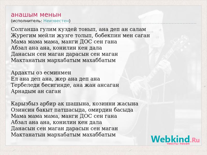 Солганша гулим куздей тонып, ана деп ан салам Журегим мейли жузге толып, бобекпин мен саган Мама мама мама, манги ДОС сен гана Абзал ана ана, конилин кен дала Данасын сен маган дарасын сен маган Мактанатын мархабатым махаббатым Ардакты оз есминмен Ел ана деп ана, жер ана деп ана Тербеледи бесигинде, ана жан ансаган Арнадым ан саган Карызбыз арбир ак шашына, козинни жасына Озинсин бакыт патшасыда, омирдин басыда Мама мама мама, манги ДОС сен гана Абзал ана ана, конилин кен дала Данасын сен маган дарасын сен маган Мактанатын мархабатым махаббатым
