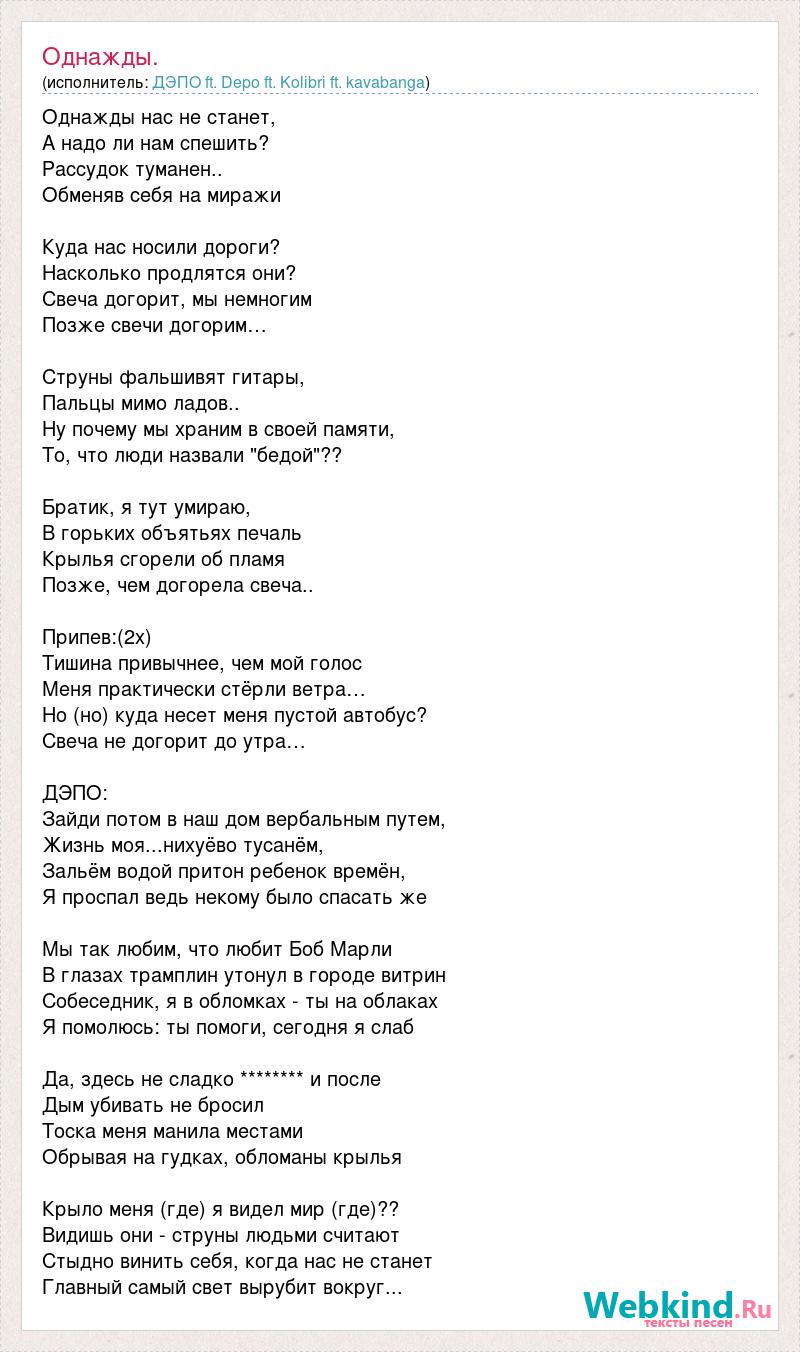 Однажды нас не станет, А надо ли нам спешить? Рассудок туманен.. Обменяв себя на миражи Куда нас носили дороги? Насколько продлятся они? Свеча догорит, мы немногим Позже свечи догорим… Струны фальшивят гитары, Пальцы мимо ладов.. Ну почему мы храним в своей памяти, То, что люди назвали "бедой"?? Братик, я тут умираю, В горьких объятьях печаль Крылья сгорели об пламя Позже, чем догорела свеча.. Припев:(2х) Тишина привычнее, чем мой голос Меня практически стёрли ветра… Но (но) куда несет меня пустой автобус? Свеча не догорит до утра… ДЭПО: Зайди потом в наш дом вербальным путем, Жизнь моя...нихуёво тусанём, Зальём водой притон ребенок времён, Я проспал ведь некому было спасать же Мы так любим, что любит Боб Марли В глазах трамплин утонул в городе витрин Собеседник, я в обломках - ты на облаках Я помолюсь: ты помоги, сегодня я слаб Да, здесь не сладко ******** и после Дым убивать не бросил Тоска меня манила местами Обрывая на гудках, обломаны крылья Крыло меня (где) я видел мир (где)?? Видишь они - струны людьми считают Стыдно винить себя, когда нас не станет Главный самый свет вырубит вокруг...