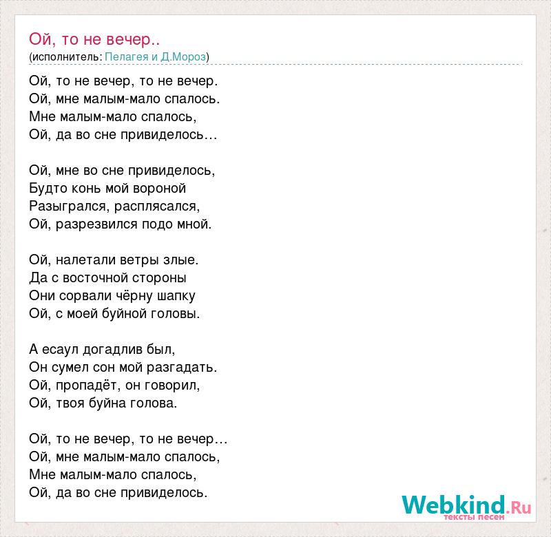 Ой, то не вечер, то не вечер. Ой, мне малым-мало спалось. Мне малым-мало спалось, Ой, да во сне привиделось… Ой, мне во сне привиделось, Будто конь мой вороной Разыгрался, расплясался, Ой, разрезвился подо мной. Ой, налетали ветры злые. Да с восточной стороны Они сорвали чёрну шапку Ой, с моей буйной головы. А есаул догадлив был, Он сумел сон мой разгадать. Ой, пропадёт, он говорил, Ой, твоя буйна голова. Ой, то не вечер, то не вечер… Ой, мне малым-мало спалось, Мне малым-мало спалось, Ой, да во сне привиделось.