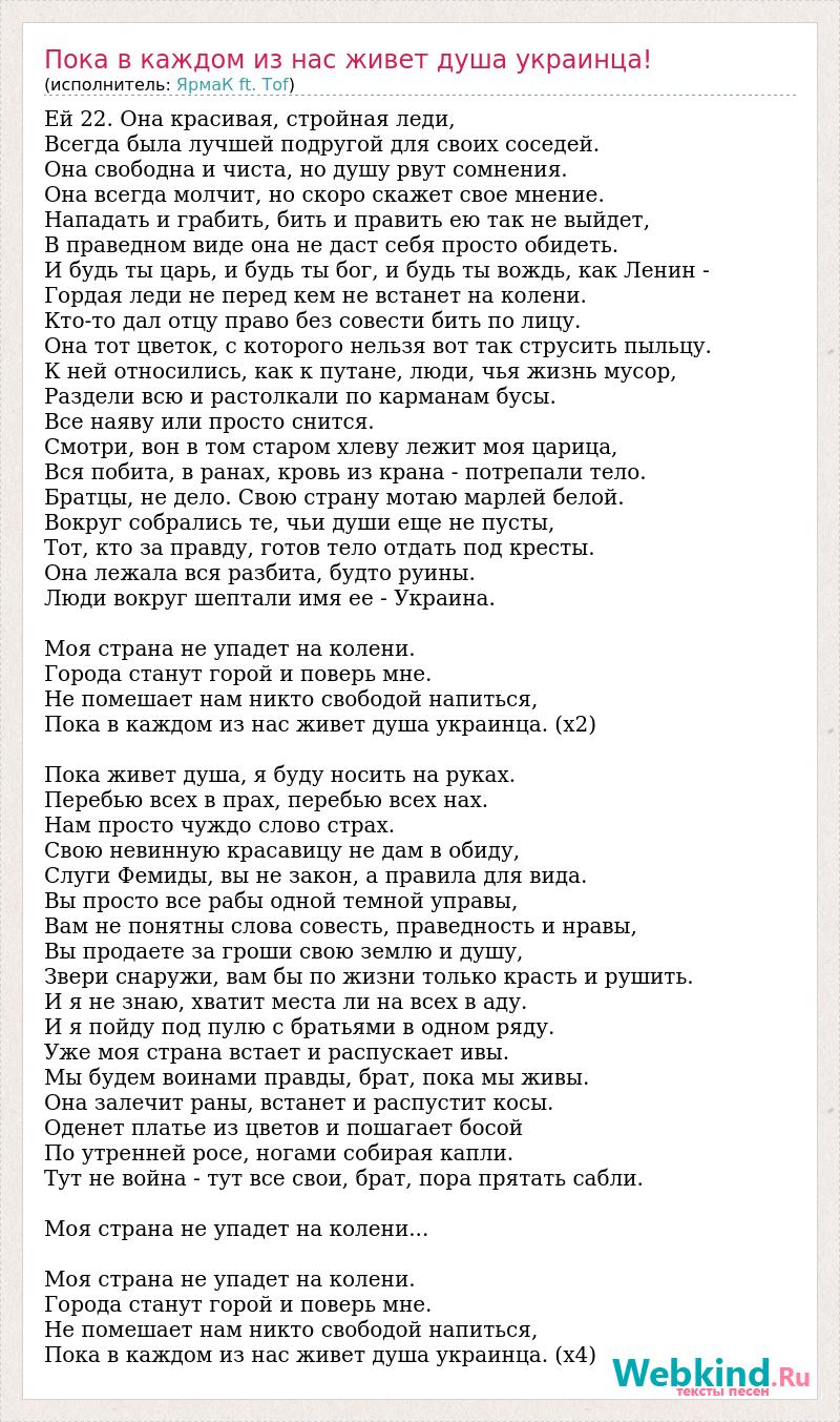 Ей 22. Она красивая, стройная леди, Всегда была лучшей подругой для своих соседей. Она свободна и чиста, но душу рвут сомнения. Она всегда молчит, но скоро скажет свое мнение. Нападать и грабить, бить и править ею так не выйдет, В праведном виде она не даст себя просто обидеть. И будь ты царь, и будь ты бог, и будь ты вождь, как Ленин - Гордая леди не перед кем не встанет на колени. Кто-то дал отцу право без совести бить по лицу. Она тот цветок, с которого нельзя вот так струсить пыльцу. К ней относились, как к путане, люди, чья жизнь мусор, Раздели всю и растолкали по карманам бусы. Все наяву или просто снится. Смотри, вон в том старом хлеву лежит моя царица, Вся побита, в ранах, кровь из крана - потрепали тело. Братцы, не дело. Свою страну мотаю марлей белой. Вокруг собрались те, чьи души еще не пусты, Тот, кто за правду, готов тело отдать под кресты. Она лежала вся разбита, будто руины. Люди вокруг шептали имя ее - Украина. Моя страна не упадет на колени. Города станут горой и поверь мне. Не помешает нам никто свободой напиться, Пока в каждом из нас живет душа украинца. (x2) Пока живет душа, я буду носить на руках. Перебью всех в прах, перебью всех нах. Нам просто чуждо слово страх. Свою невинную красавицу не дам в обиду, Слуги Фемиды, вы не закон, а правила для вида. Вы просто все рабы одной темной управы, Вам не понятны слова совесть, праведность и нравы, Вы продаете за гроши свою землю и душу, Звери снаружи, вам бы по жизни только красть и рушить. И я не знаю, хватит места ли на всех в аду. И я пойду под пулю с братьями в одном ряду. Уже моя страна встает и распускает ивы. Мы будем воинами правды, брат, пока мы живы. Она залечит раны, встанет и распустит косы. Оденет платье из цветов и пошагает босой По утренней росе, ногами собирая капли. Тут не война - тут все свои, брат, пора прятать сабли. Моя страна не упадет на колени... Моя страна не упадет на колени. Города станут горой и поверь мне. Не помешает нам никто свободой напиться, Пока в каждом из нас живет душа украинца. (x4)