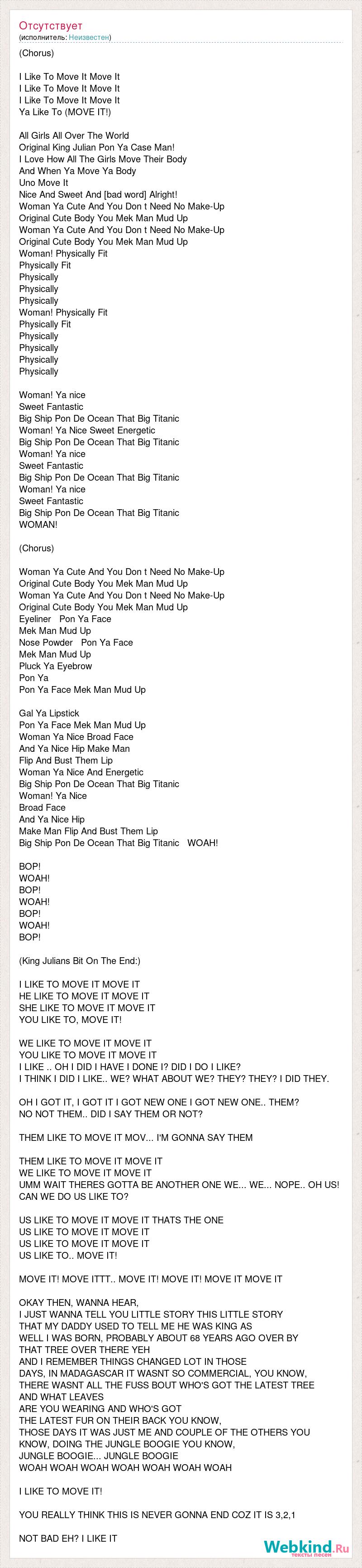 (Chorus) I Like To Move It Move It I Like To Move It Move It I Like To Move It Move It Ya Like To (MOVE IT!) All Girls All Over The World Original King Julian Pon Ya Case Man! I Love How All The Girls Move Their Body And When Ya Move Ya Body Uno Move It Nice And Sweet And [bad word] Alright! Woman Ya Cute And You Don t Need No Make-Up Original Cute Body You Mek Man Mud Up Woman Ya Cute And You Don t Need No Make-Up Original Cute Body You Mek Man Mud Up Woman! Physically Fit Physically Fit Physically Physically Physically Woman! Physically Fit Physically Fit Physically Physically Physically Physically Woman! Ya nice Sweet Fantastic Big Ship Pon De Ocean That Big Titanic Woman! Ya Nice Sweet Energetic Big Ship Pon De Ocean That Big Titanic Woman! Ya nice Sweet Fantastic Big Ship Pon De Ocean That Big Titanic Woman! Ya nice Sweet Fantastic Big Ship Pon De Ocean That Big Titanic WOMAN! (Chorus) Woman Ya Cute And You Don t Need No Make-Up Original Cute Body You Mek Man Mud Up Woman Ya Cute And You Don t Need No Make-Up Original Cute Body You Mek Man Mud Up Eyeliner Pon Ya Face Mek Man Mud Up Nose Powder Pon Ya Face Mek Man Mud Up Pluck Ya Eyebrow Pon Ya Pon Ya Face Mek Man Mud Up Gal Ya Lipstick Pon Ya Face Mek Man Mud Up Woman Ya Nice Broad Face And Ya Nice Hip Make Man Flip And Bust Them Lip Woman Ya Nice And Energetic Big Ship Pon De Ocean That Big Titanic Woman! Ya Nice Broad Face And Ya Nice Hip Make Man Flip And Bust Them Lip Big Ship Pon De Ocean That Big Titanic WOAH! BOP! WOAH! BOP! WOAH! BOP! WOAH! BOP! (King Julians Bit On The End:) I LIKE TO MOVE IT MOVE IT HE LIKE TO MOVE IT MOVE IT SHE LIKE TO MOVE IT MOVE IT YOU LIKE TO, MOVE IT! WE LIKE TO MOVE IT MOVE IT YOU LIKE TO MOVE IT MOVE IT I LIKE .. OH I DID I HAVE I DONE I? DID I DO I LIKE? I THINK I DID I LIKE.. WE? WHAT ABOUT WE? THEY? THEY? I DID THEY. OH I GOT IT, I GOT IT I GOT NEW ONE I GOT NEW ONE.. THEM? NO NOT THEM.. DID I SAY THEM OR NOT? THEM LIKE TO MOVE IT MOV... I'M GONNA SAY THEM THEM LIKE TO MOVE IT MOVE IT WE LIKE TO MOVE IT MOVE IT UMM WAIT THERES GOTTA BE ANOTHER ONE WE... WE... NOPE.. OH US! CAN WE DO US LIKE TO? US LIKE TO MOVE IT MOVE IT THATS THE ONE US LIKE TO MOVE IT MOVE IT US LIKE TO MOVE IT MOVE IT US LIKE TO.. MOVE IT! MOVE IT! MOVE ITTT.. MOVE IT! MOVE IT! MOVE IT MOVE IT OKAY THEN, WANNA HEAR, I JUST WANNA TELL YOU LITTLE STORY THIS LITTLE STORY THAT MY DADDY USED TO TELL ME HE WAS KING AS WELL I WAS BORN, PROBABLY ABOUT 68 YEARS AGO OVER BY THAT TREE OVER THERE YEH AND I REMEMBER THINGS CHANGED LOT IN THOSE DAYS, IN MADAGASCAR IT WASNT SO COMMERCIAL, YOU KNOW, THERE WASNT ALL THE FUSS BOUT WHO'S GOT THE LATEST TREE AND WHAT LEAVES ARE YOU WEARING AND WHO'S GOT THE LATEST FUR ON THEIR BACK YOU KNOW, THOSE DAYS IT WAS JUST ME AND COUPLE OF THE OTHERS YOU KNOW, DOING THE JUNGLE BOOGIE YOU KNOW, JUNGLE BOOGIE... JUNGLE BOOGIE WOAH WOAH WOAH WOAH WOAH WOAH WOAH I LIKE TO MOVE IT! YOU REALLY THINK THIS IS NEVER GONNA END COZ IT IS 3,2,1 NOT BAD EH? I LIKE IT