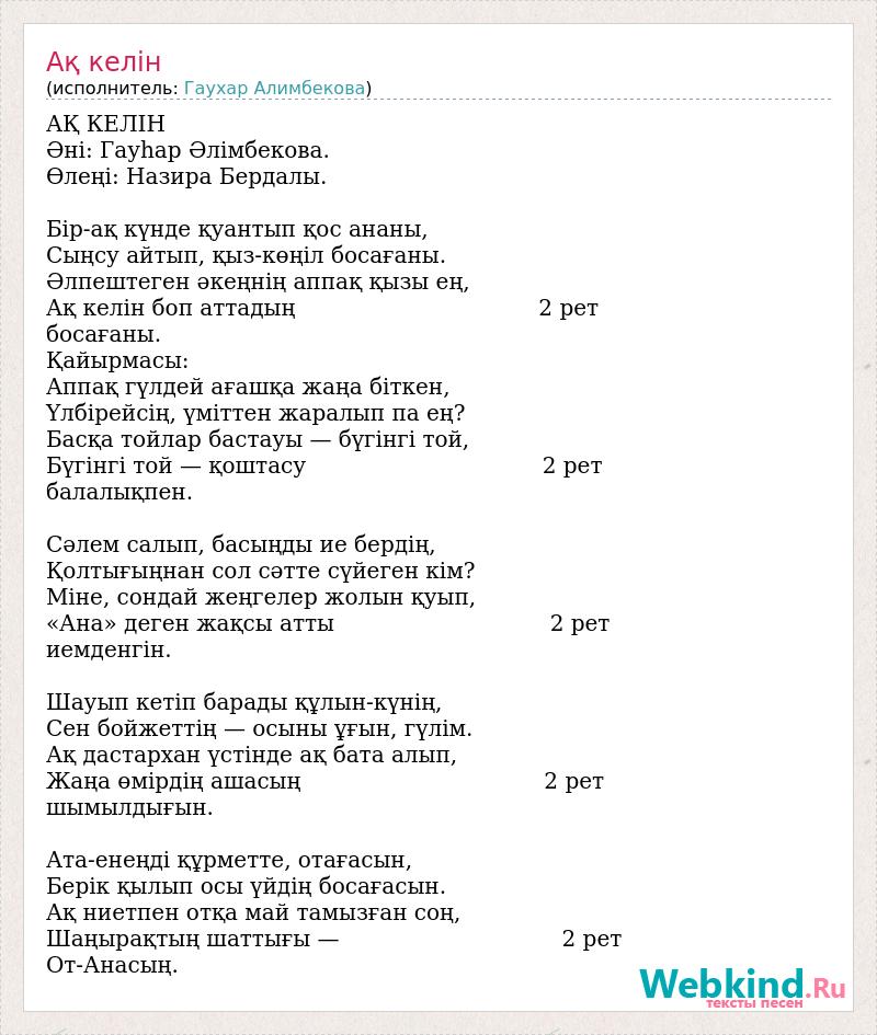 АҚ КЕЛIН Әнi: Гауһар Әлiмбекова. Өлеңi: Назира Бердалы. Бiр-ақ күнде қуантып қос ананы, Сыңсу айтып, қыз-көңiл босағаны. Әлпештеген әкеңнiң аппақ қызы ең, Ақ келiн боп аттадың 2 рет босағаны. Қайырмасы: Аппақ гүлдей ағашқа жаңа бiткен, Үлбiрейсiң, үмiттен жаралып па ең? Басқа тойлар бастауы — бүгiнгi той, Бүгiнгi той — қоштасу 2 рет балалықпен. Сәлем салып, басыңды ие бердiң, Қолтығыңнан сол сәтте сүйеген кiм? Мiне, сондай жеңгелер жолын қуып, «Ана» деген жақсы атты 2 рет иемденгiн. Шауып кетiп барады құлын-күнiң, Сен бойжеттiң — осыны ұғын, гүлiм. Ақ дастархан үстiнде ақ бата алып, Жаңа өмiрдiң ашасың 2 рет шымылдығын. Ата-енеңдi құрметте, отағасын, Берiк қылып осы үйдiң босағасын. Ақ ниетпен отқа май тамызған соң, Шаңырақтың шаттығы — 2 рет От-Анасың.