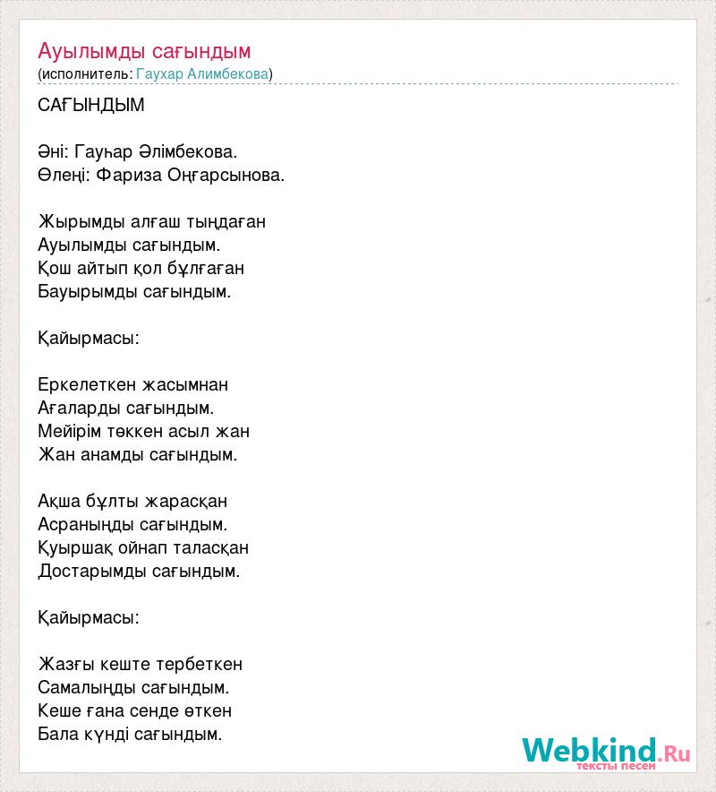 САҒЫНДЫМ Әні: Гауһар Әлімбекова. Өлеңі: Фариза Оңғарсынова. Жырымды алғаш тыңдаған Ауылымды сағындым. Қош айтып қол бұлғаған Бауырымды сағындым. Қайырмасы: Еркелеткен жасымнан Ағаларды сағындым. Мейірім төккен асыл жан Жан анамды сағындым. Ақша бұлты жарасқан Асраныңды сағындым. Қуыршақ ойнап таласқан Достарымды сағындым. Қайырмасы: Жазғы кеште тербеткен Самалыңды сағындым. Кеше ғана сенде өткен Бала күнді сағындым.