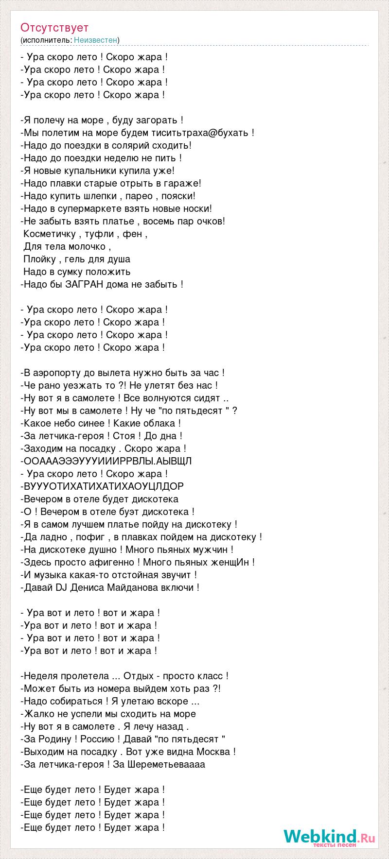 - Ура скоро лето ! Скоро жара ! -Ура скоро лето ! Скоро жара ! - Ура скоро лето ! Скоро жара ! -Ура скоро лето ! Скоро жара ! -Я полечу на море , буду загорать ! -Мы полетим на море будем тиситьтраха@бухать ! -Надо до поездки в солярий сходить! -Надо до поездки неделю не пить ! -Я новые купальники купила уже! -Надо плавки старые отрыть в гараже! -Надо купить шлепки , парео , пояски! -Надо в супермаркете взять новые носки! -Не забыть взять платье , восемь пар очков! Косметичку , туфли , фен , Для тела молочко , Плойку , гель для душа Надо в сумку положить -Надо бы ЗАГРАН дома не забыть ! - Ура скоро лето ! Скоро жара ! -Ура скоро лето ! Скоро жара ! - Ура скоро лето ! Скоро жара ! -Ура скоро лето ! Скоро жара ! -В аэропорту до вылета нужно быть за час ! -Че рано уезжать то ?! Не улетят без нас ! -Ну вот я в самолете ! Все волнуются сидят .. -Ну вот мы в самолете ! Ну че "по пятьдесят " ? -Какое небо синее ! Какие облака ! -За летчика-героя ! Стоя ! До дна ! -Заходим на посадку . Скоро жара ! -ООАААЭЭЭУУУИИИРРВЛЫ.АЫВЩЛ - Ура скоро лето ! Скоро жара ! -ВУУУОТИХАТИХАТИХАОУЦЛДОР -Вечером в отеле будет дискотека -О ! Вечером в отеле буэт дискотека ! -Я в самом лучшем платье пойду на дискотеку ! -Да ладно , пофиг , в плавках пойдем на дискотеку ! -На дискотеке душно ! Много пьяных мужчин ! -Здесь просто афигенно ! Много пьяных женщИн ! -И музыка какая-то отстойная звучит ! -Давай DJ Дениса Майданова включи ! - Ура вот и лето ! вот и жара ! -Ура вот и лето ! вот и жара ! - Ура вот и лето ! вот и жара ! -Ура вот и лето ! вот и жара ! -Неделя пролетела ... Отдых - просто класс ! -Может быть из номера выйдем хоть раз ?! -Надо собираться ! Я улетаю вскоре ... -Жалко не успели мы сходить на море -Ну вот я в самолете . Я лечу назад . -За Родину ! Россию ! Давай "по пятьдесят " -Выходим на посадку . Вот уже видна Москва ! -За летчика-героя ! За Шереметьеваааа -Еще будет лето ! Будет жара ! -Еще будет лето ! Будет жара ! -Еще будет лето ! Будет жара ! -Еще будет лето ! Будет жара !